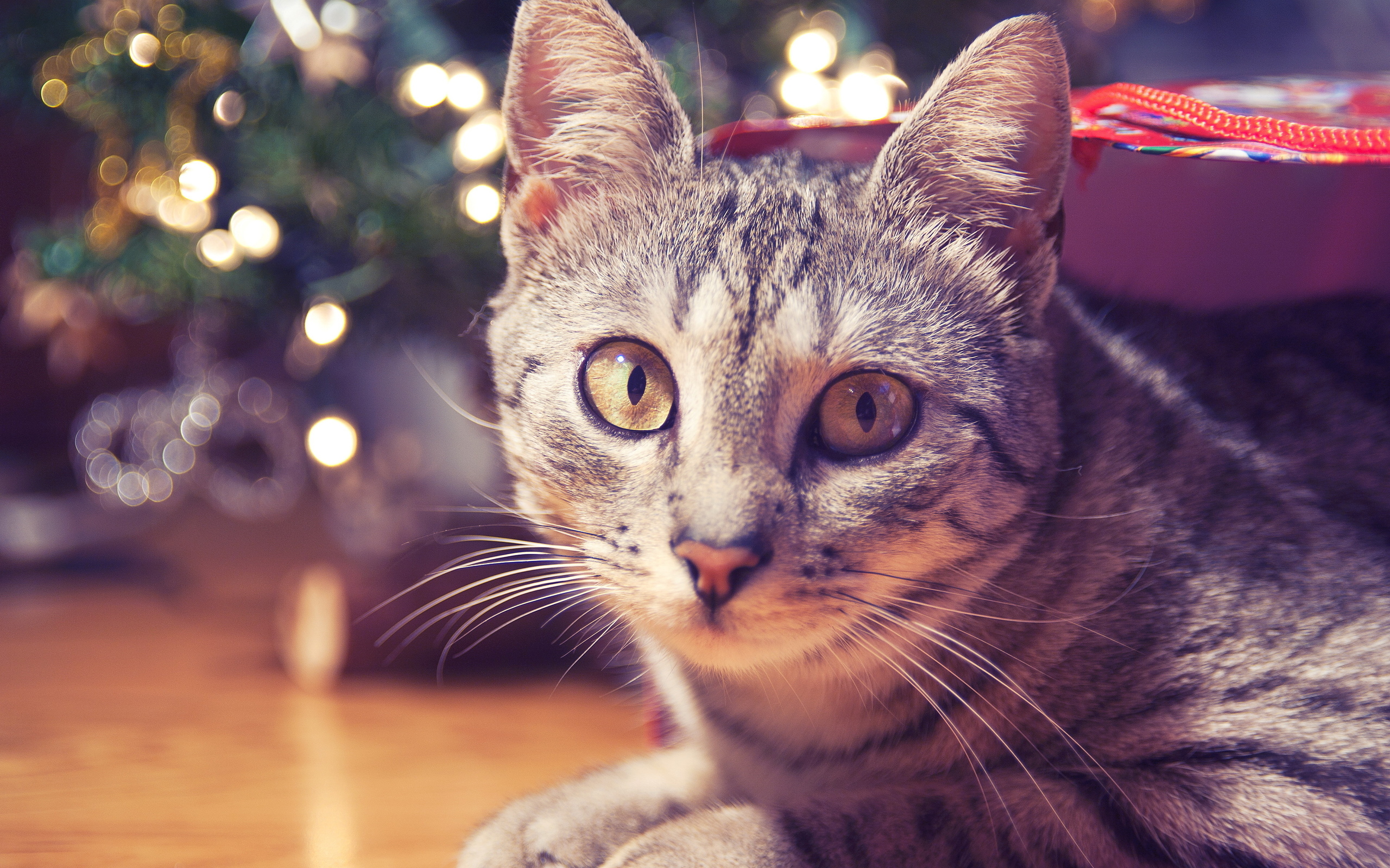 Description: A cat is sitting on the floor near a christmas tree and a bag with lights on it is looking at the camera.