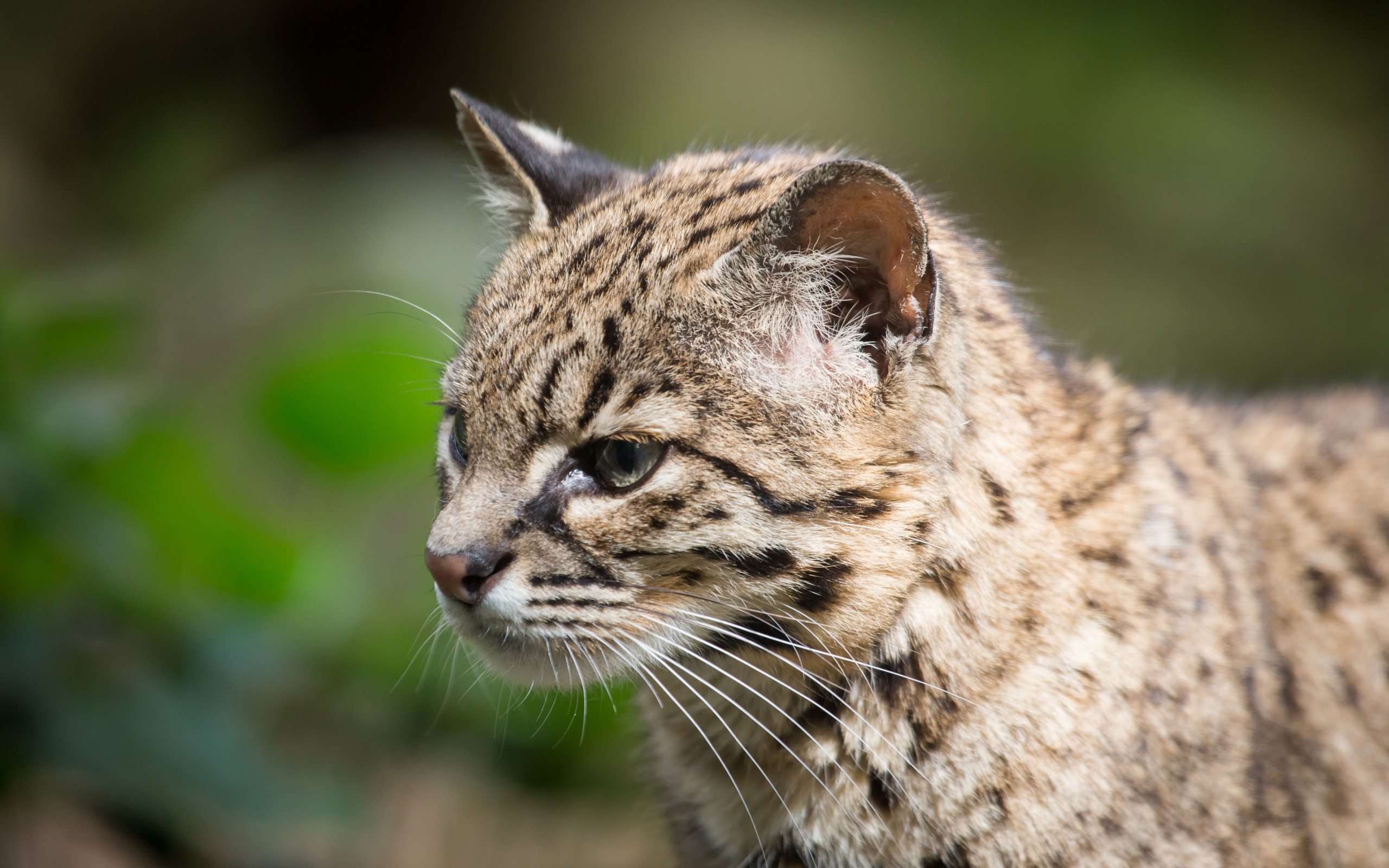 Description: A close up of a cat with a blurry background of trees and bushes in the background.