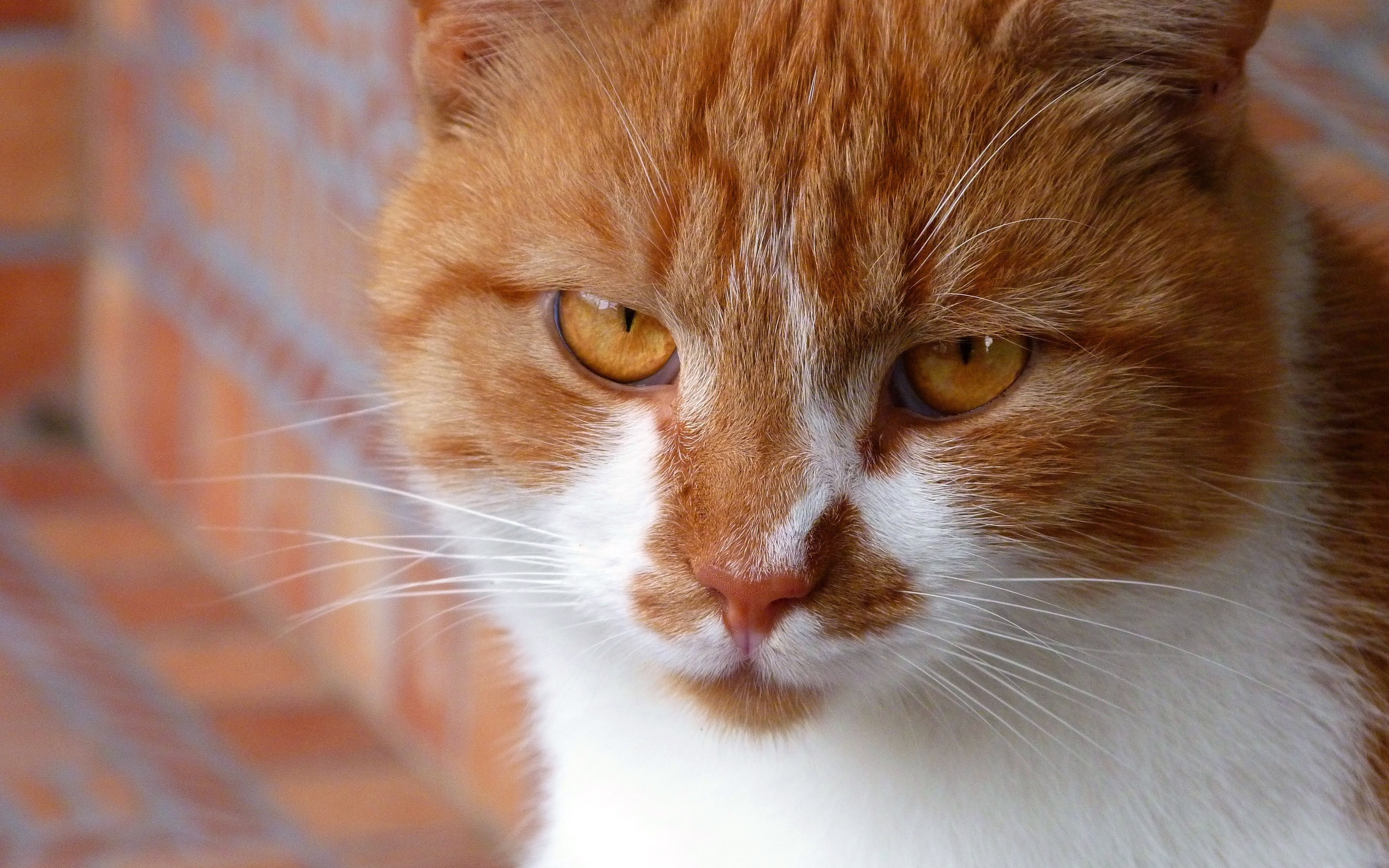 Description: A close up of a cat with a brick wall in the background and a brick floor in the background.