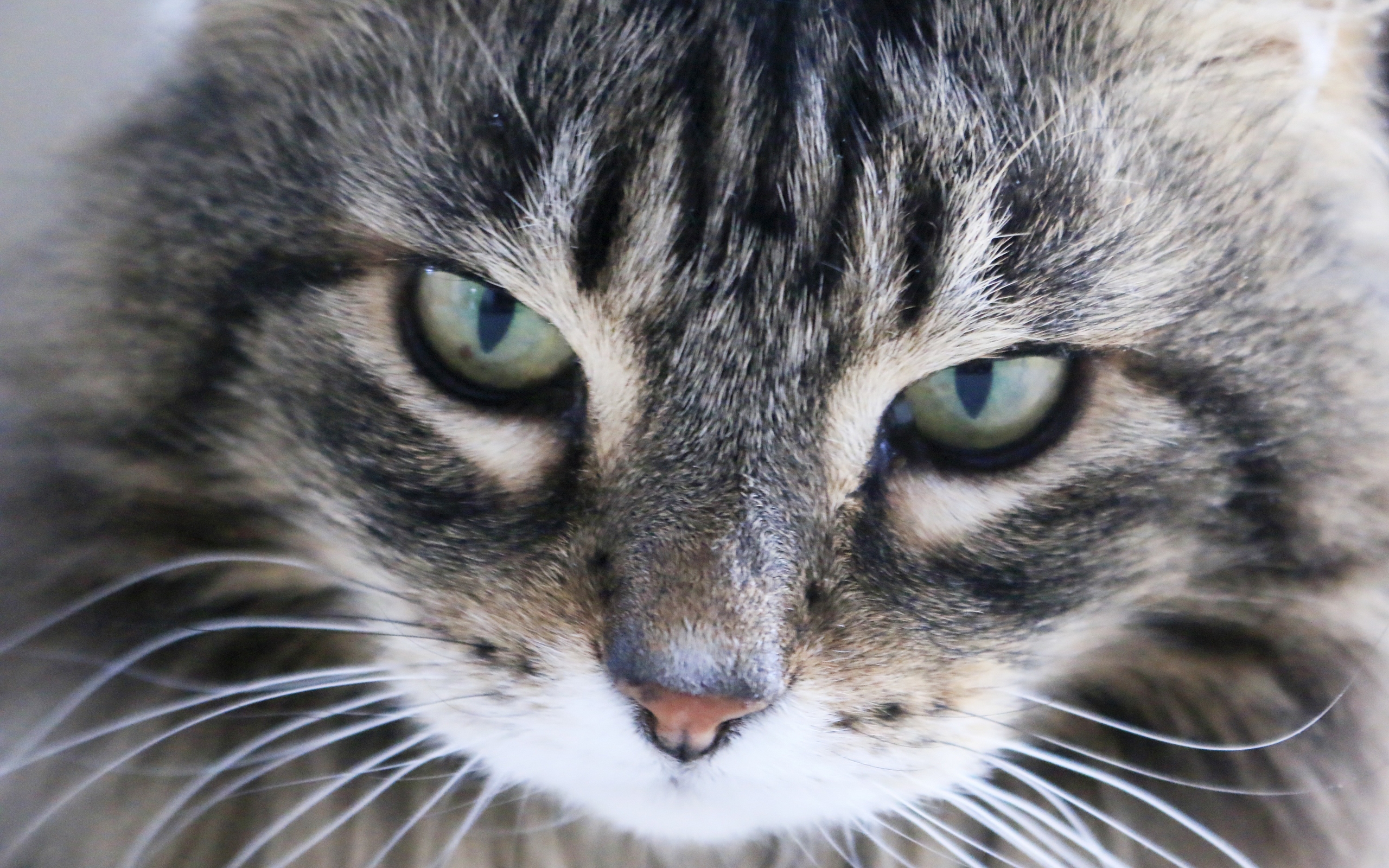 Description: A close up of a cat with green eyes looking at something with a blurry background of the image.