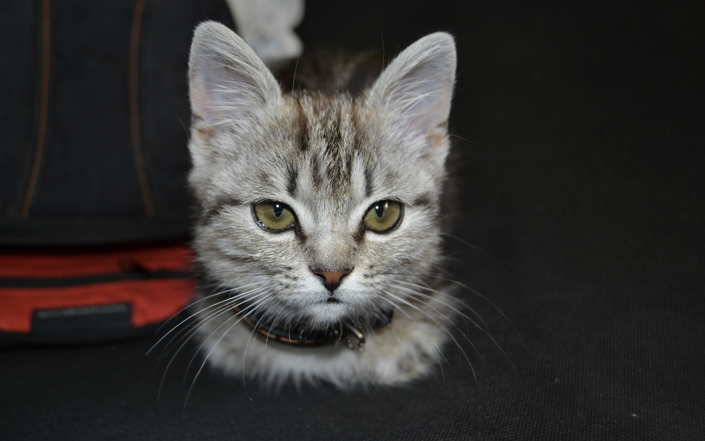 Description: A cat with a collar sitting on a black surface next to a red bag and a black bag behind it.