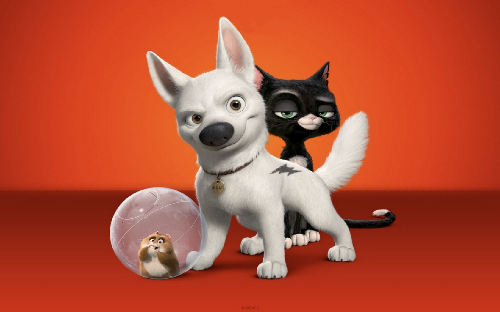 Description: A cat and a dog are standing next to each other on a red background with a ball in front of them.