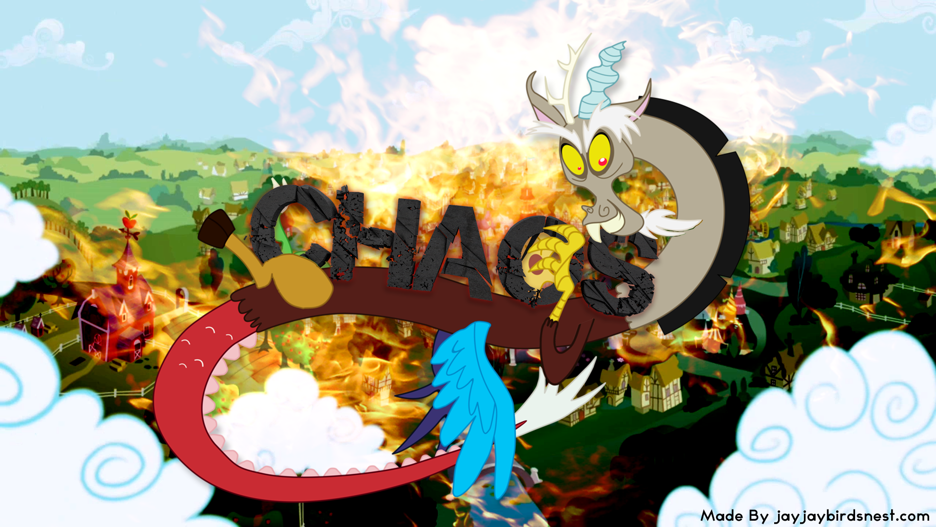 Description: A cartoon of a cat and a dragon with the word chaos above them and a fire in the background.