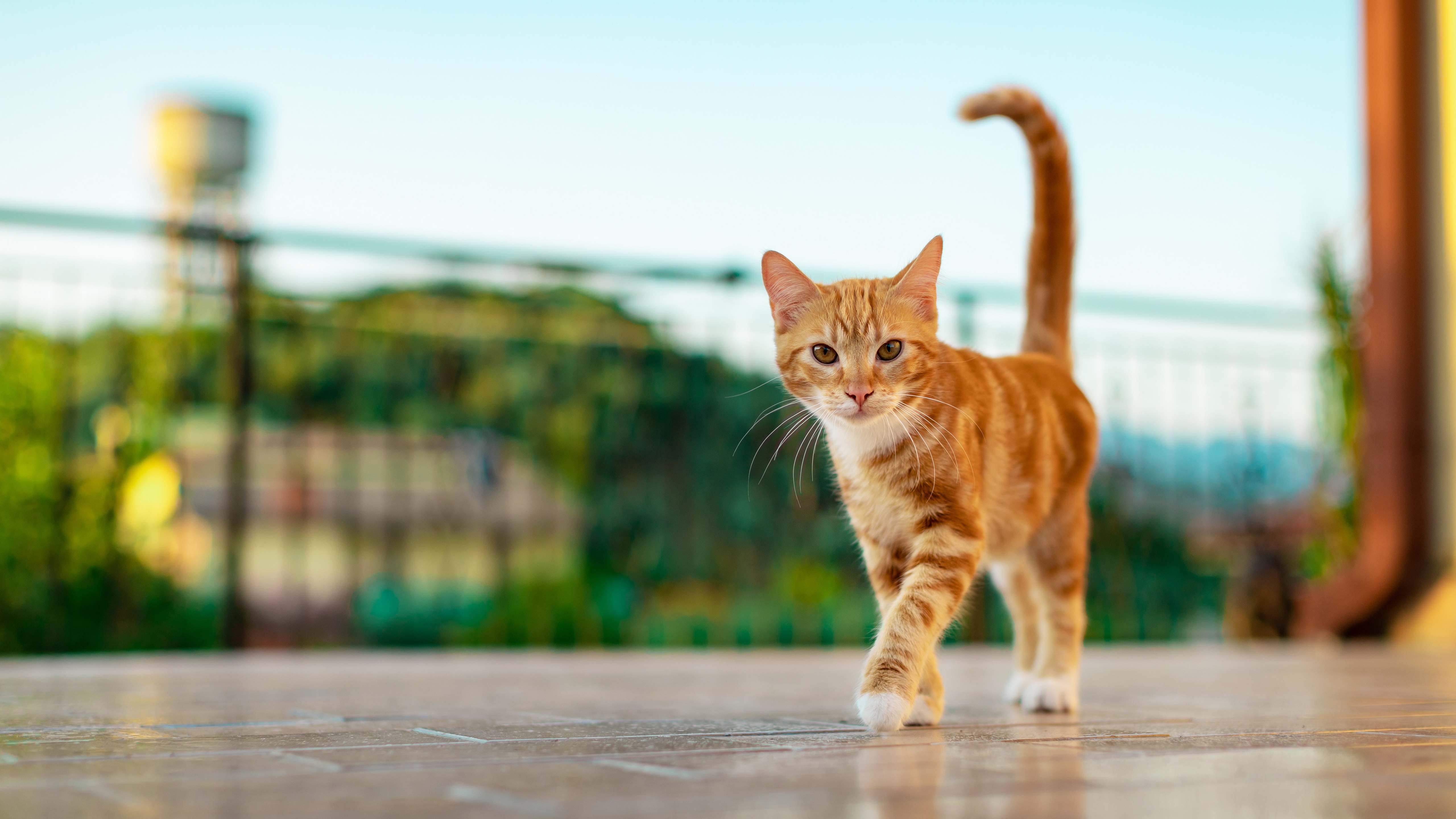 Description: A cat walking across a tiled floor next to a fence and bushes in the background.