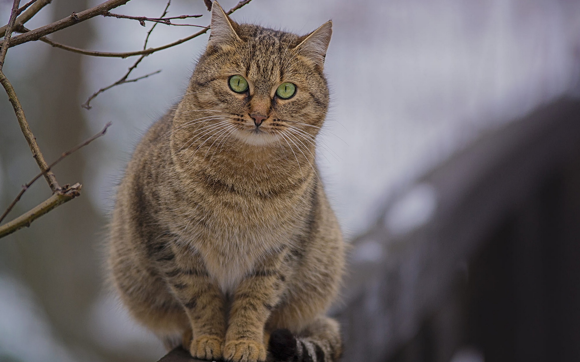 Description: A cat sitting on top of a wooden fence next to a tree branch with green eyes and a blurry background.