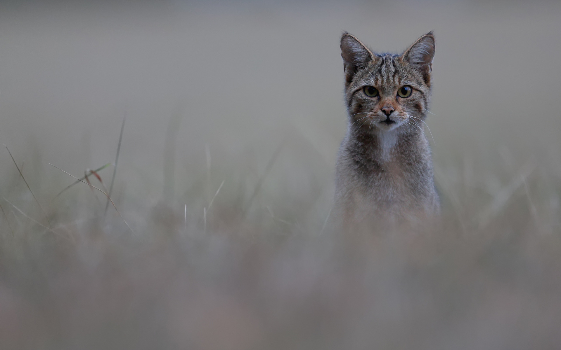 Description: A cat is standing in a field of tall grass looking at the camera with a serious look on its face.