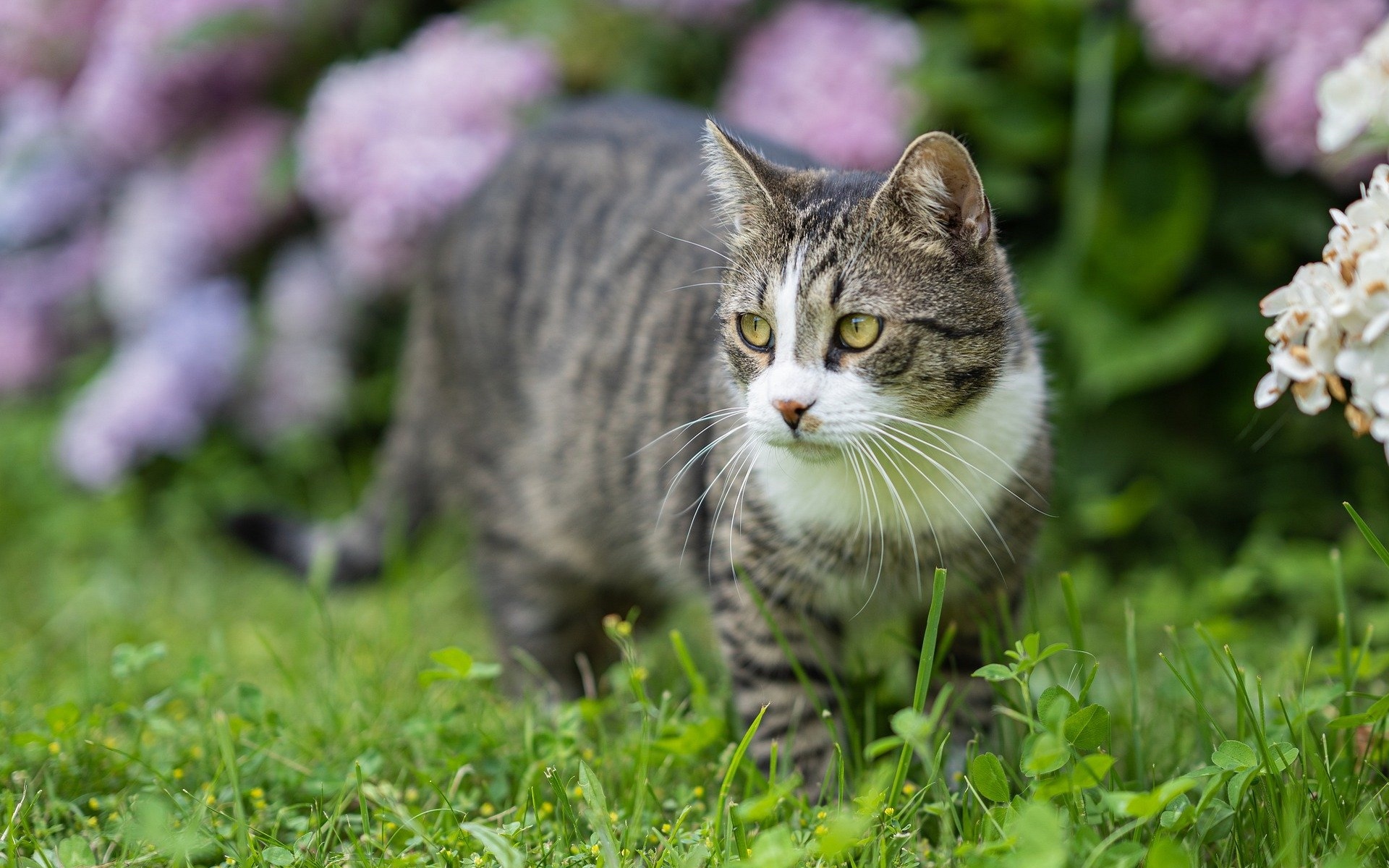 Description: A cat walking through a field of flowers and grass with a blurry background of pink and white flowers.