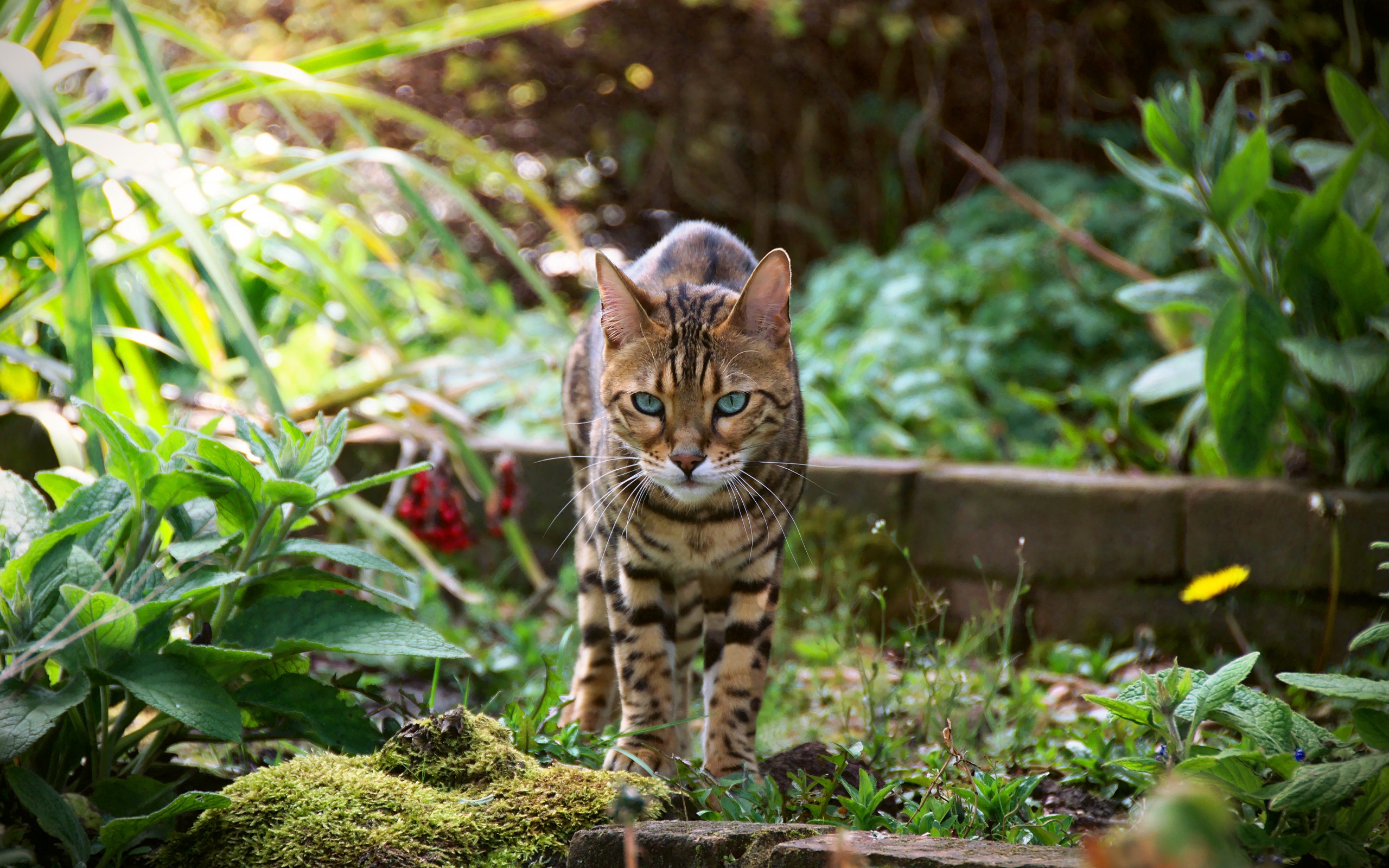 Description: A cat walking through a lush green forest filled with plants and flowers.