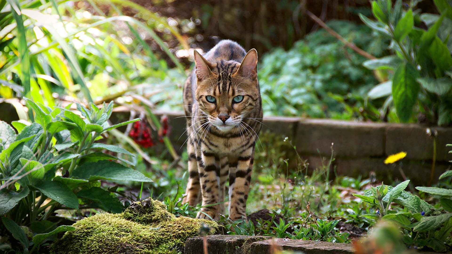 Description: A cat walking through a lush green forest filled with plants and flowers.