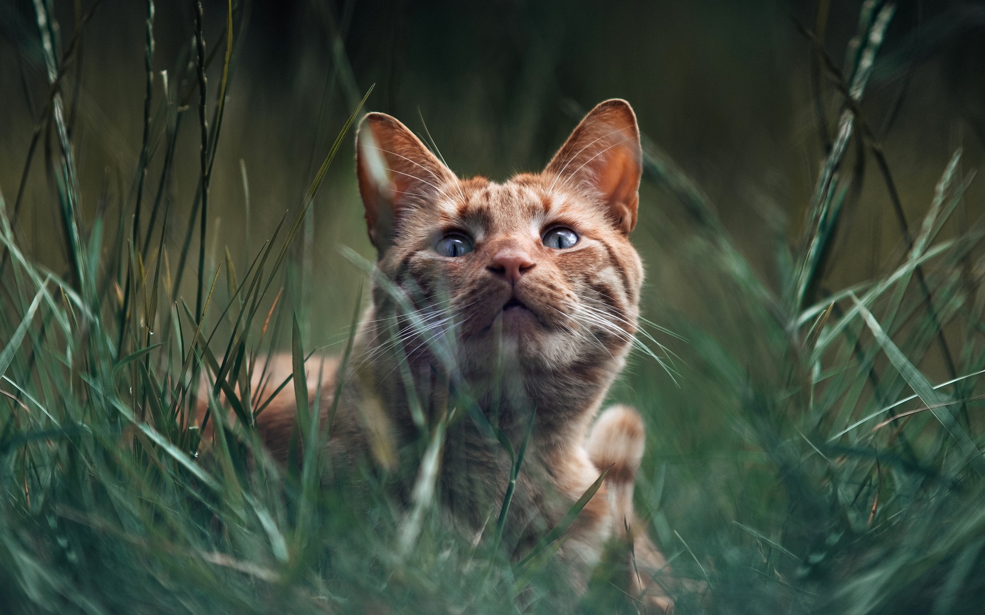 Description: A cat is looking up while sitting in the grass with its eyes wide open and it's head turned to the side.
