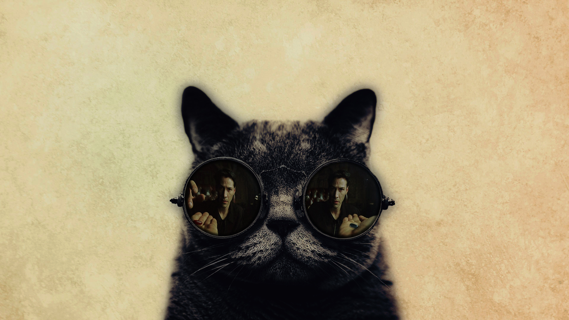 Description: A cat with some glasses on its face and a man in the reflection of it's eyes.