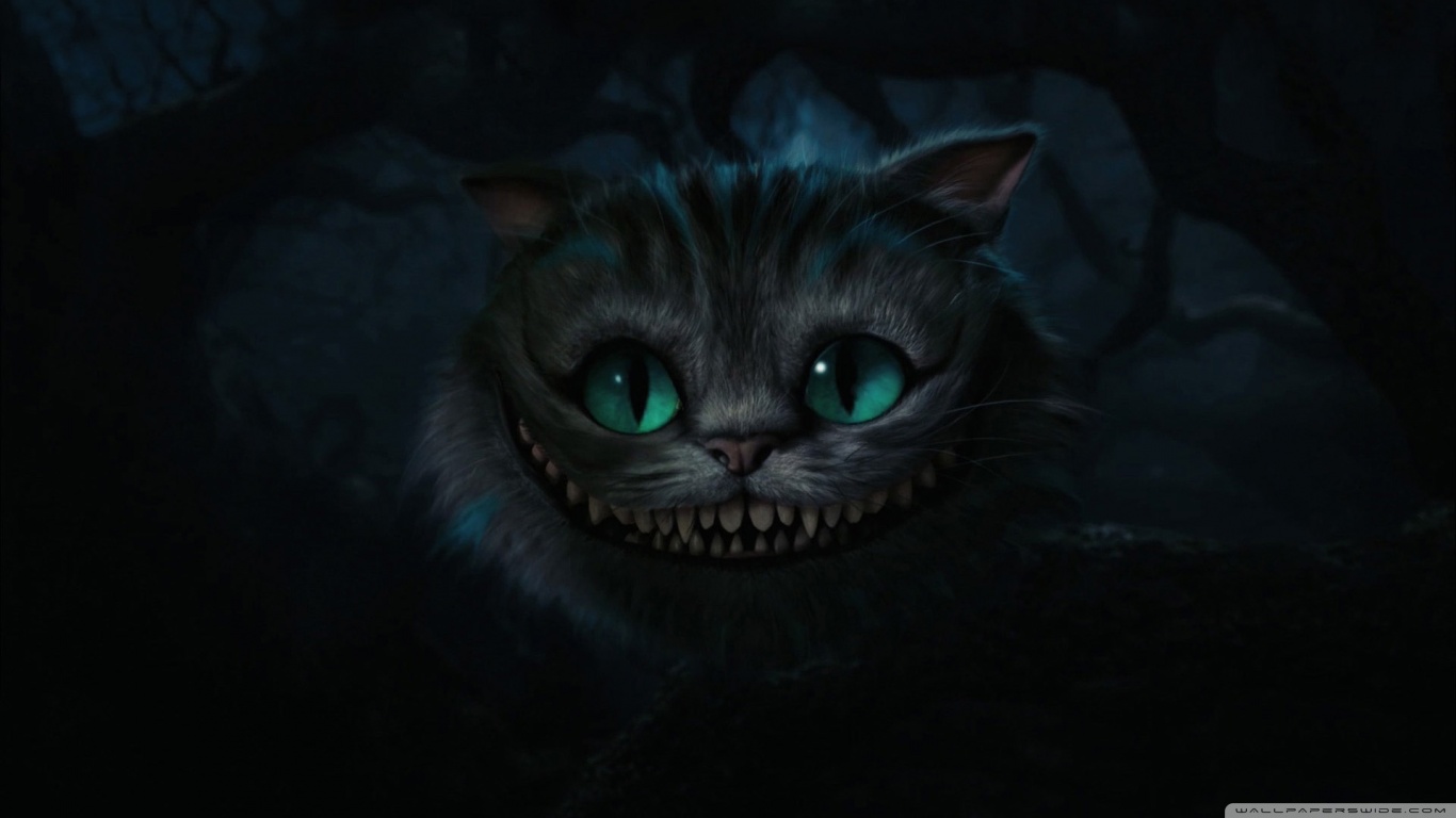 Description: A cat with glowing green eyes and a creepy smile on its face in the dark forest at night time.