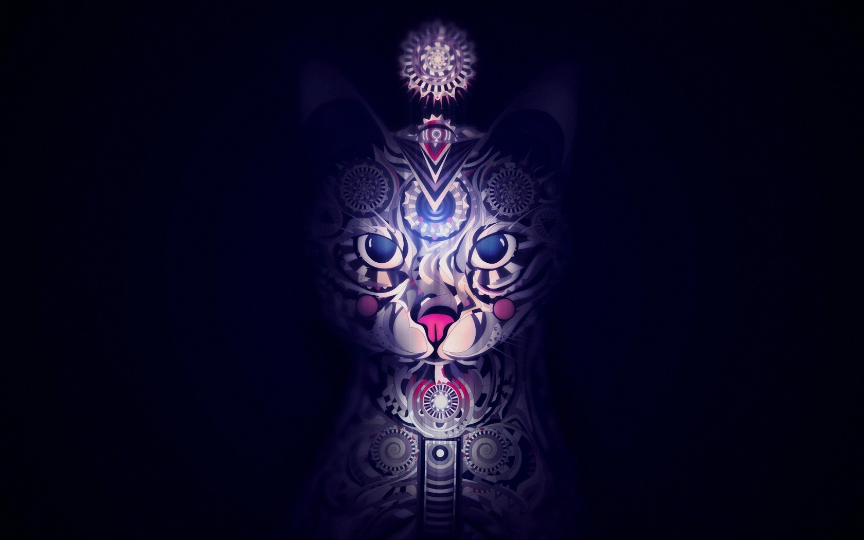 Description: A cat with a glowing face in the dark with a pattern on it's chest and eyes.