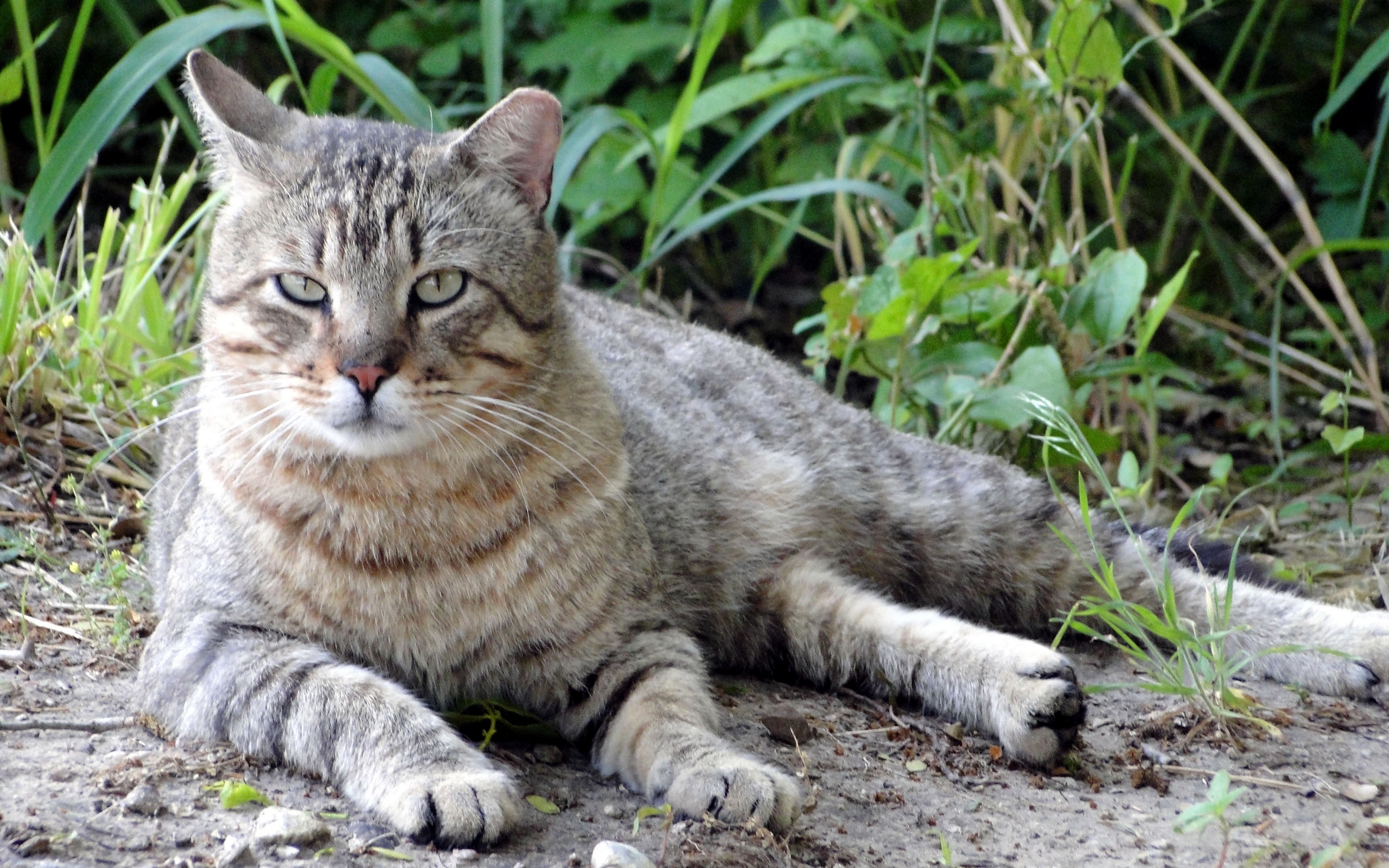 Description: A cat laying on the ground in the grass and dirt with its eyes closed and eyes wide open.