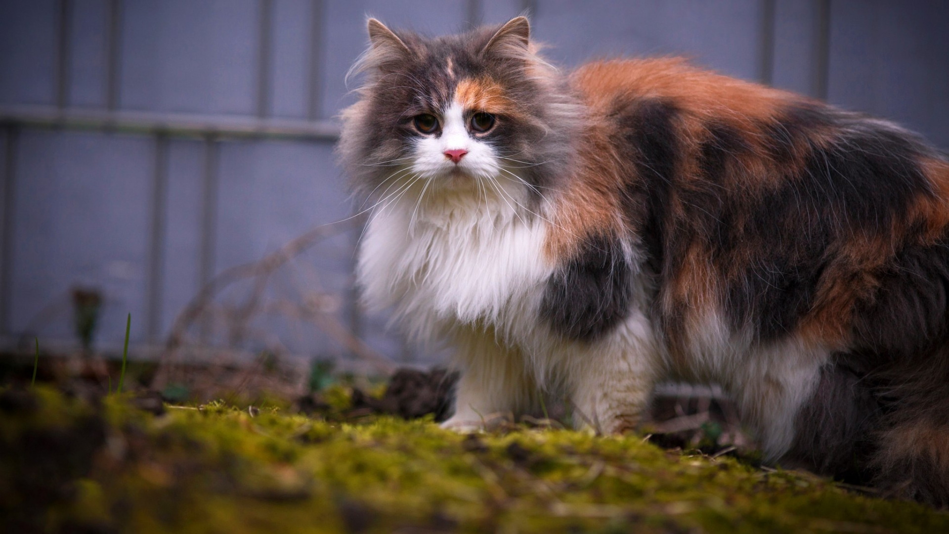 Description: A cat standing on a patch of grass near a building and fence with a blue wall behind it and a green grass area.