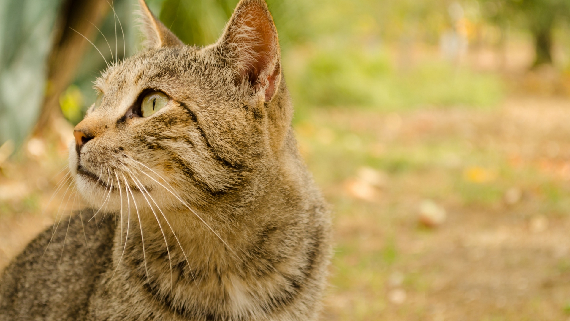 Description: A cat is sitting outside in the grass looking up at something in the distance with its eyes open and a green leaf in the background.
