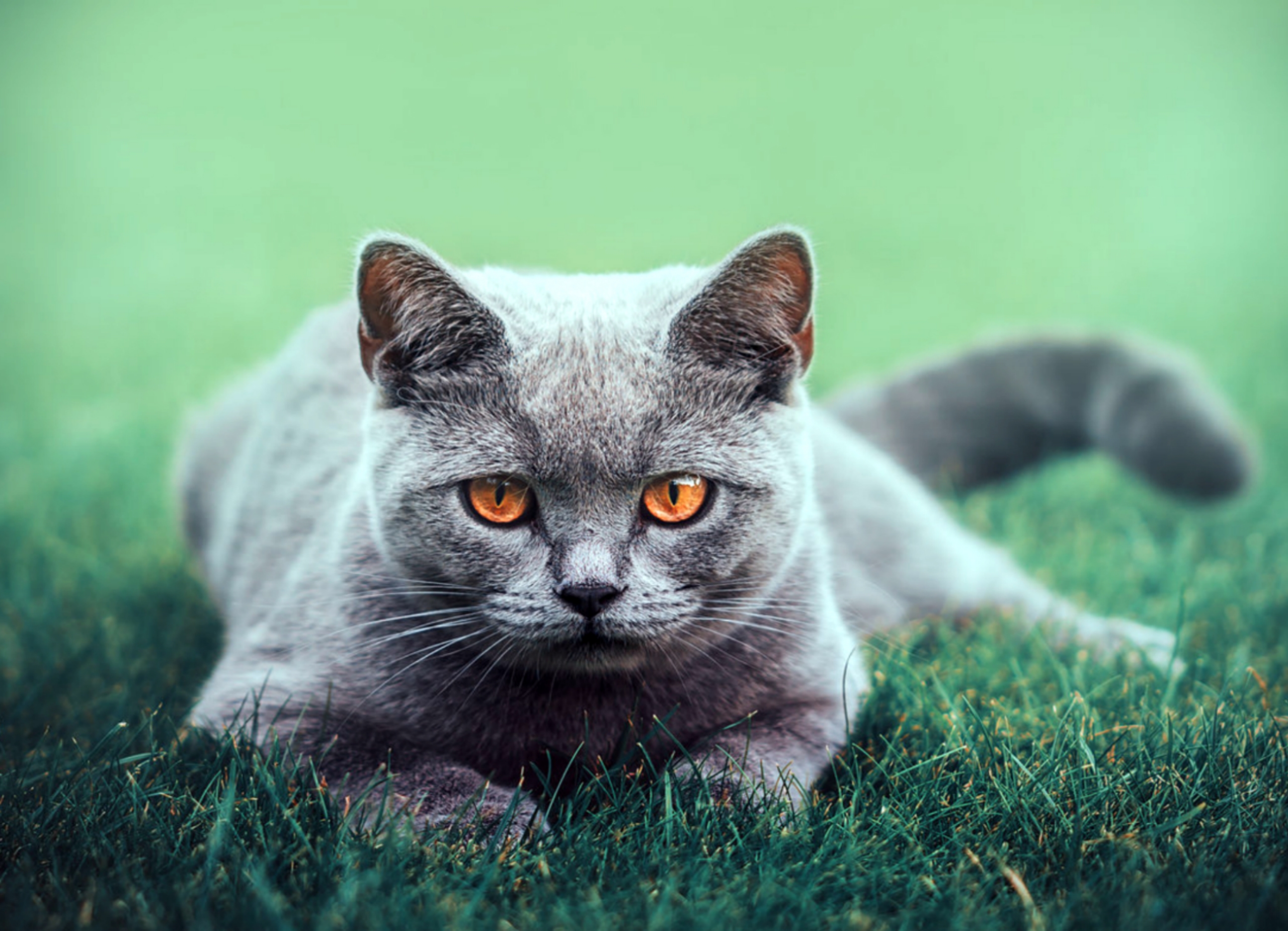 Description: A cat laying in the grass with orange eyes looking at the camera with a green background and a blurry background.