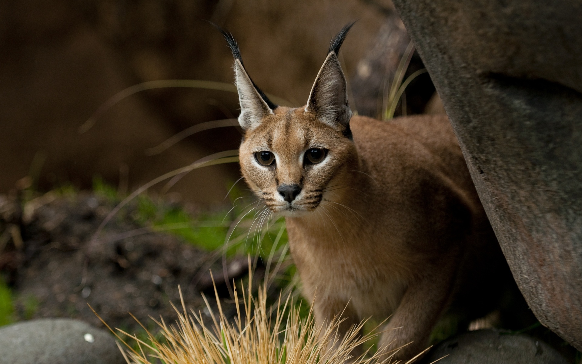 Description: A cat is standing in the grass near rocks and grass plants and rocks are in the background and a rock wall is in the foreground.
