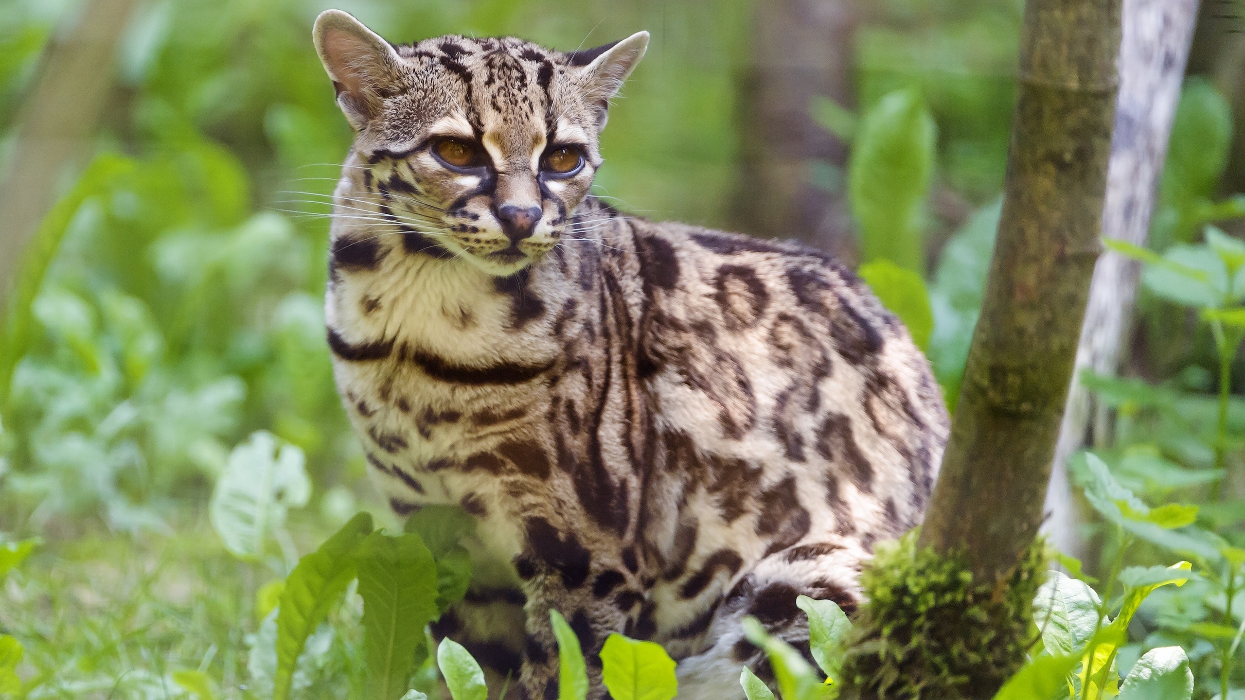 Description: A cat standing in the grass near a tree and bushes in the woods.