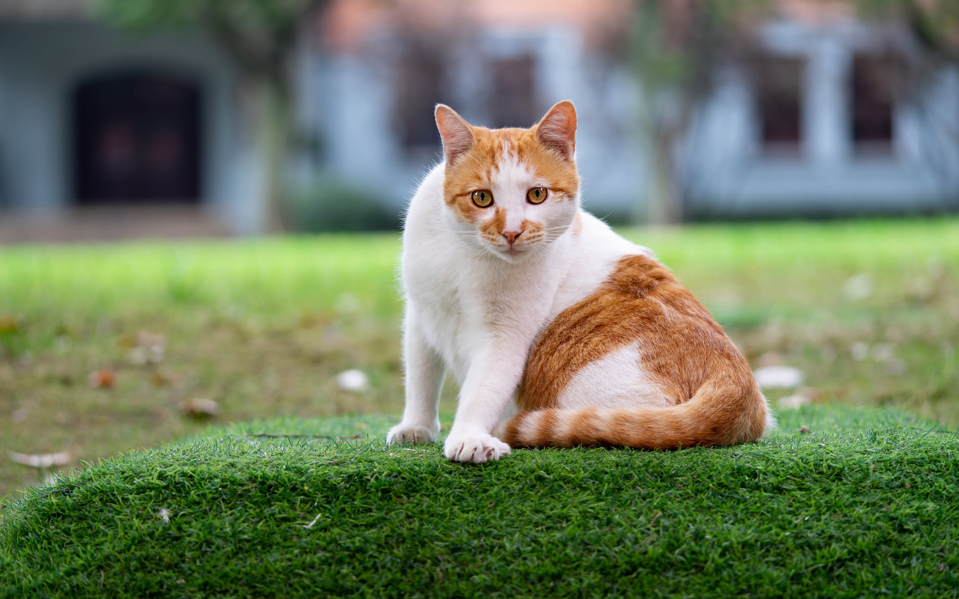Description: A cat sitting on top of a green patch of grass in a yard with a house in the background.