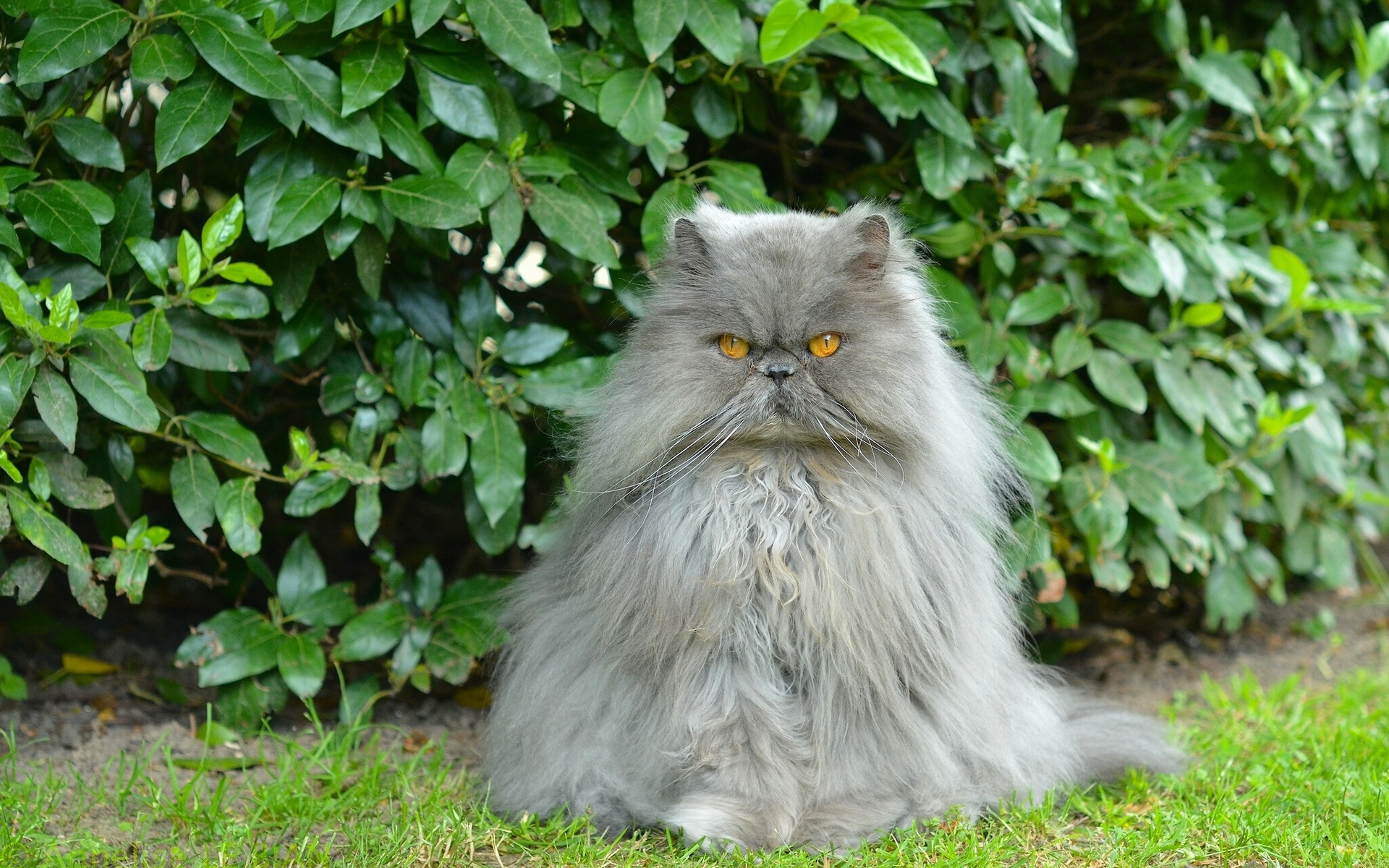 Description: A cat with a long gray fur sitting in the grass near bushes and bushes with yellow eyes and a bush behind it.