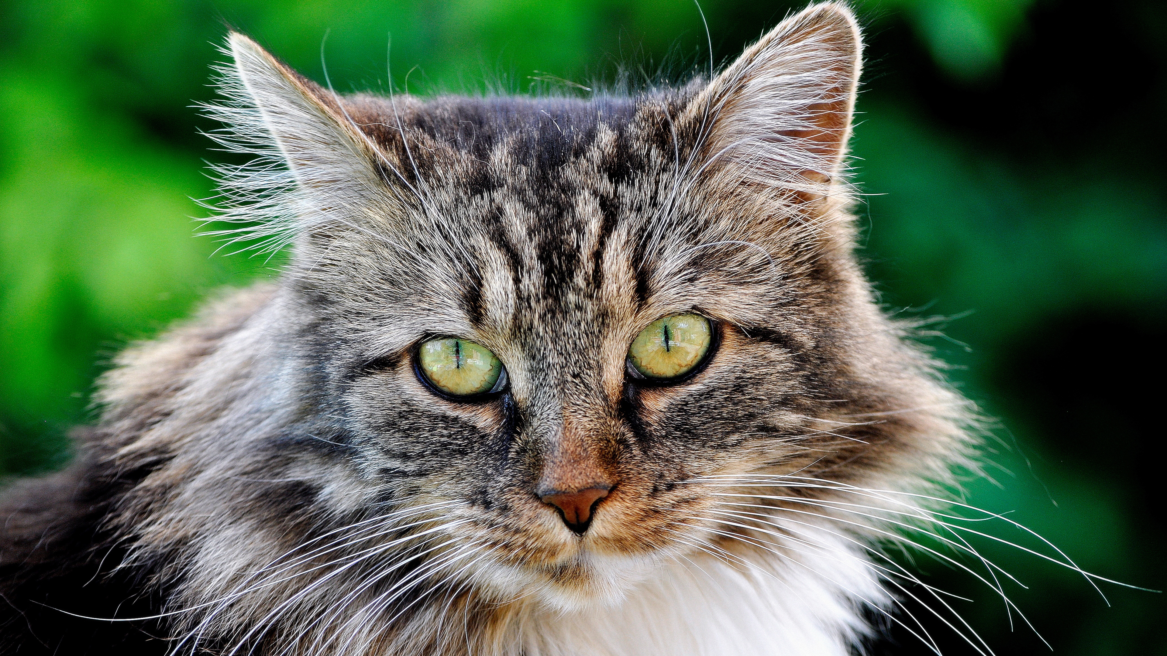 Description: A cat with green eyes looking at the camera with a blurry background of trees in the background and bushes in the foreground.