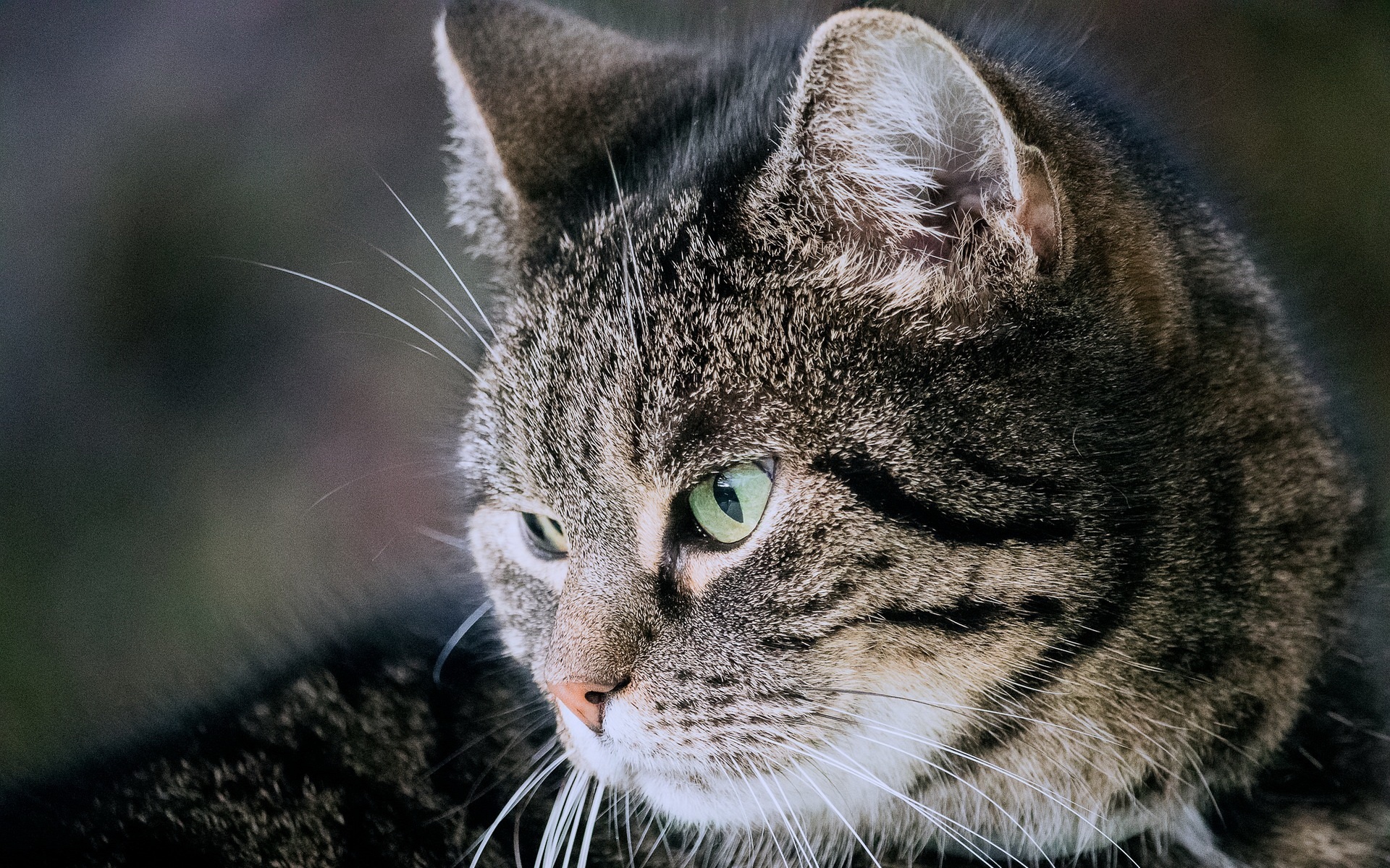 Description: A cat with green eyes looking at something in the distance with a blurry background of grass and bushes.