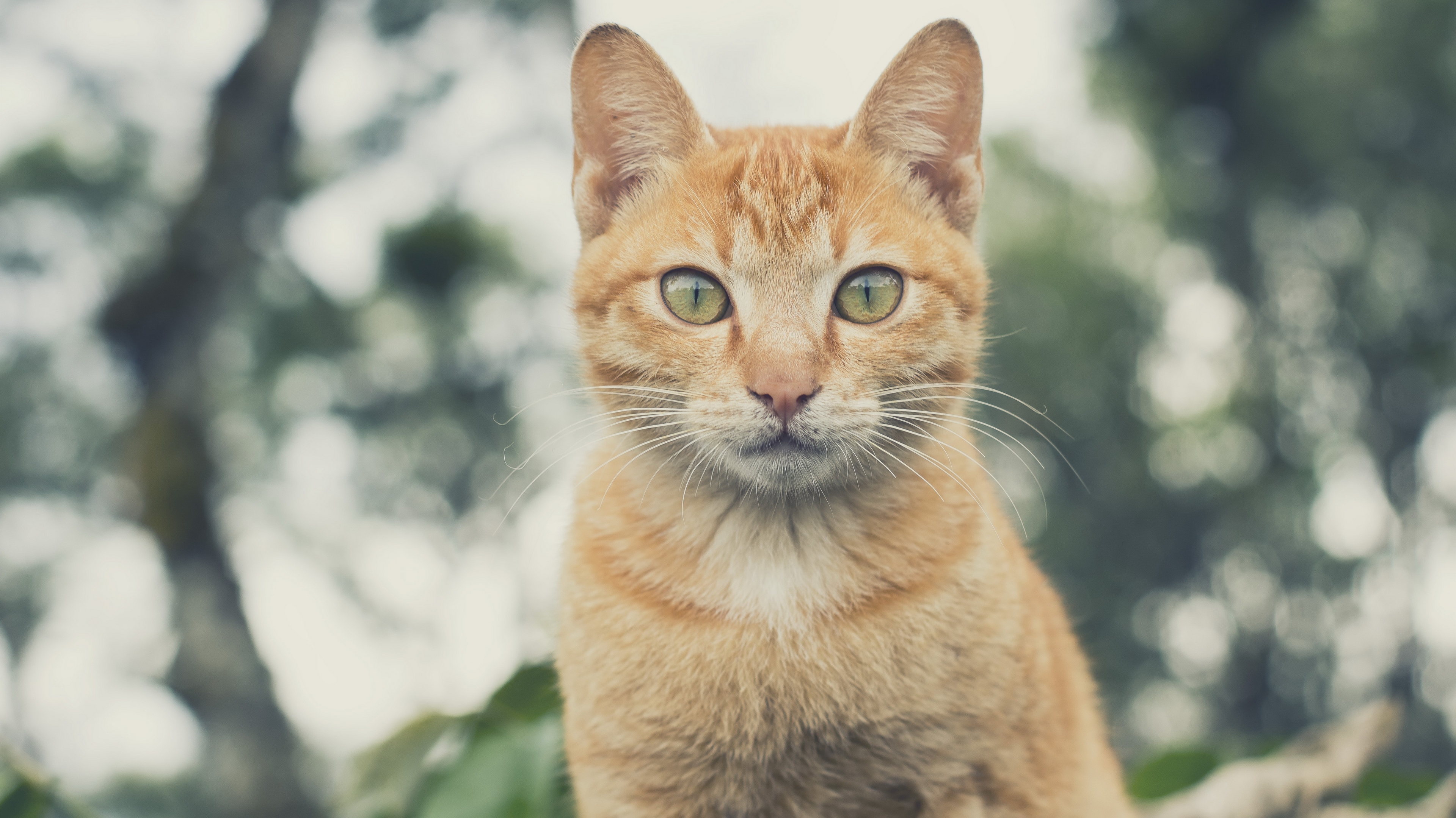 Description: A cat with green eyes sitting on a tree branch looking at the camera with a serious look on its face.