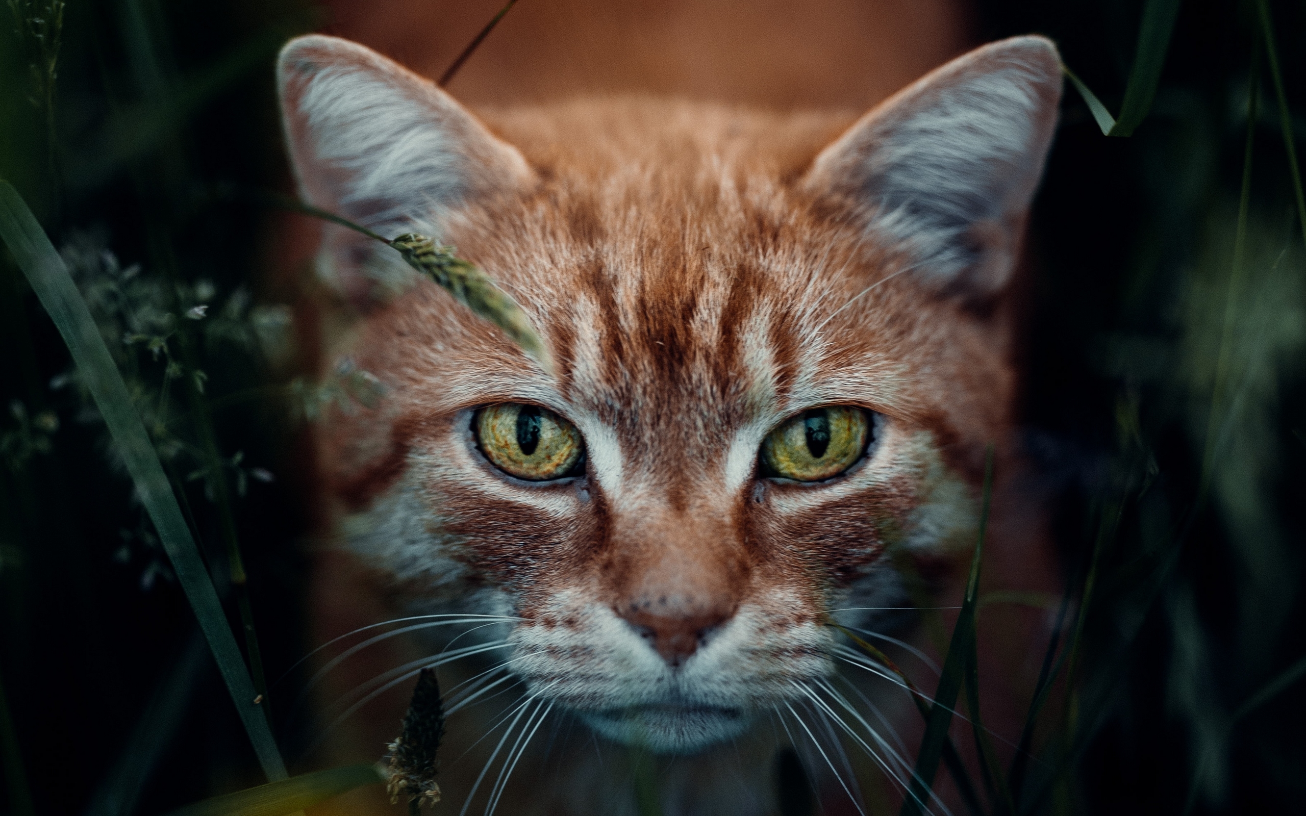 Description: A cat with green eyes looking at the camera with a blurry background of grass and weeds in the foreground.