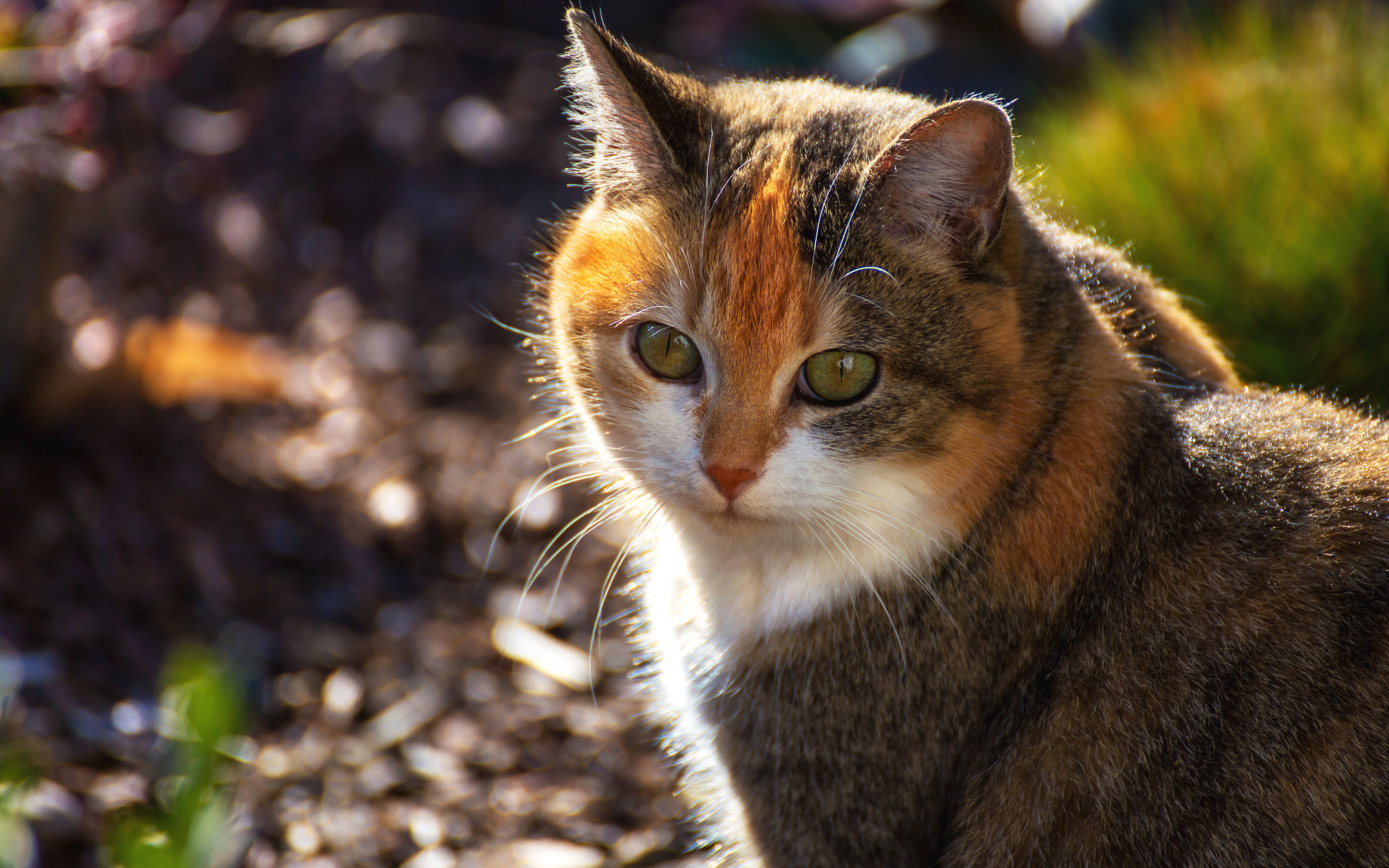 Description: A cat with green eyes sitting on a rock outside in the sun with grass and flowers in the background.