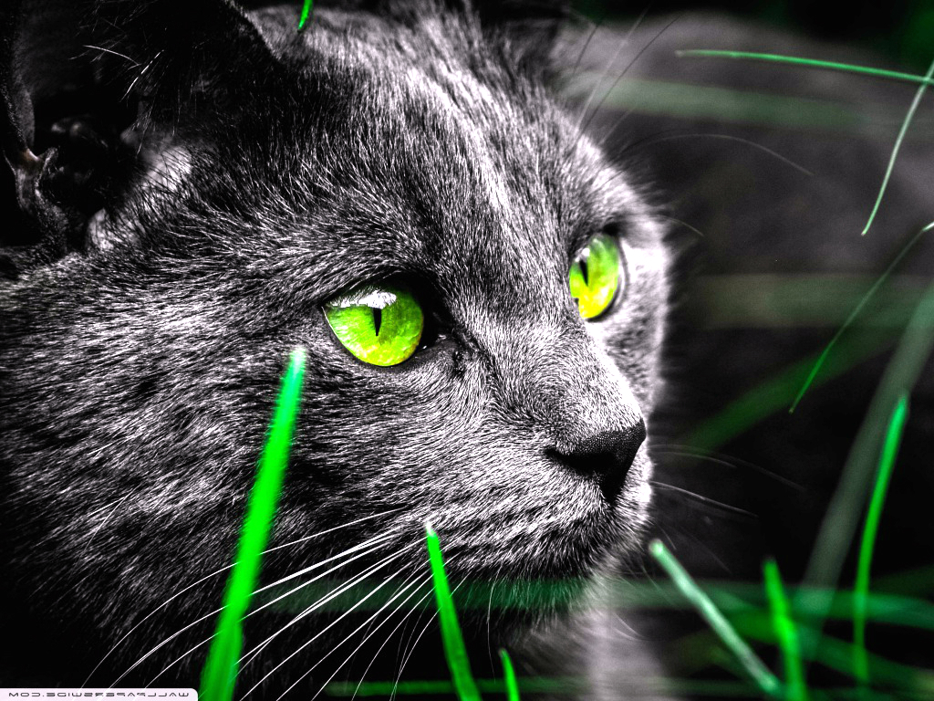 Description: A cat with green eyes is staring at something in the distance with long grass in front of it and a black background.