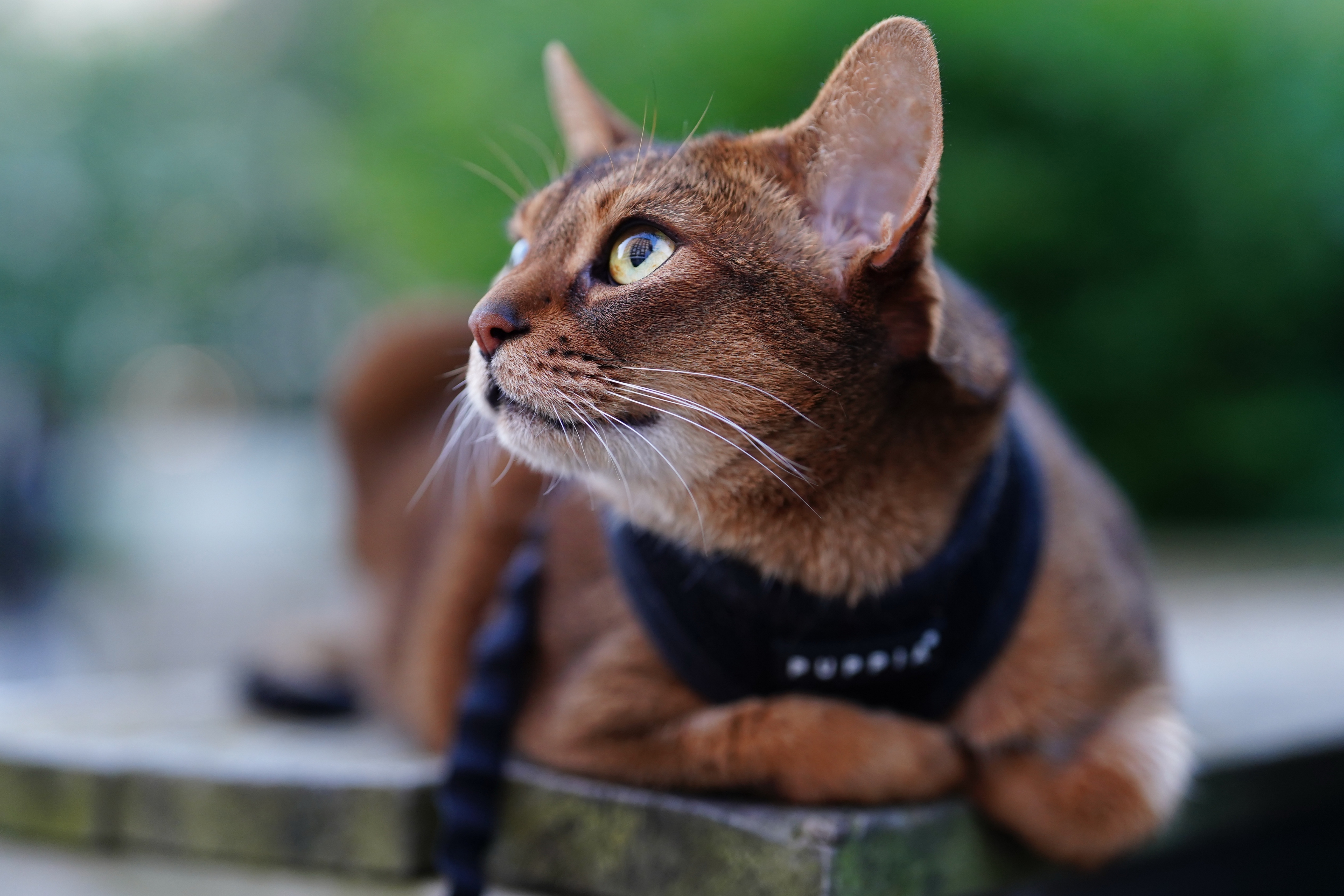 Description: A cat with a black harness on sitting on a ledge looking up at something in the distance with a blurry background.