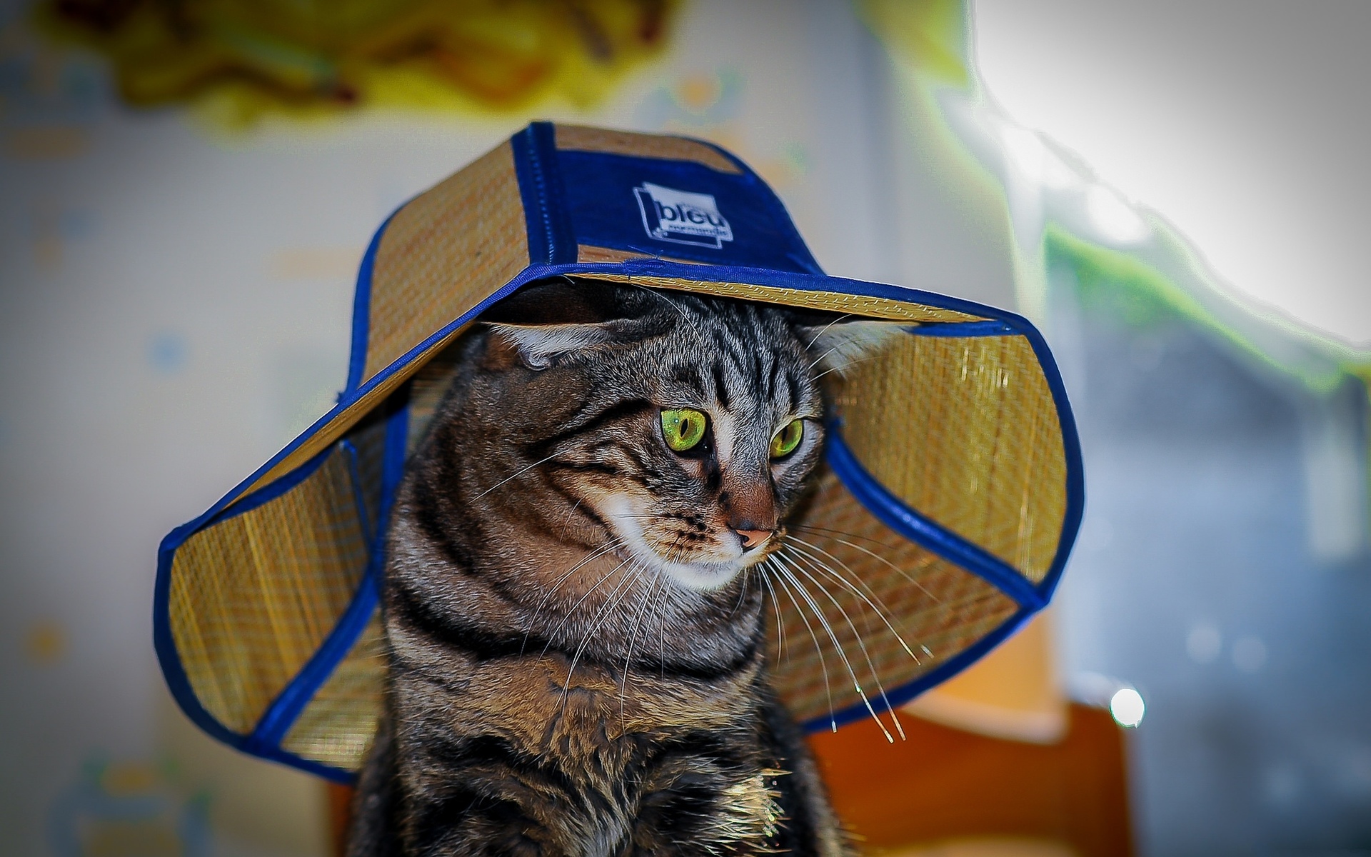 Description: A cat wearing a hat with a blue band around it's head and eyes.
