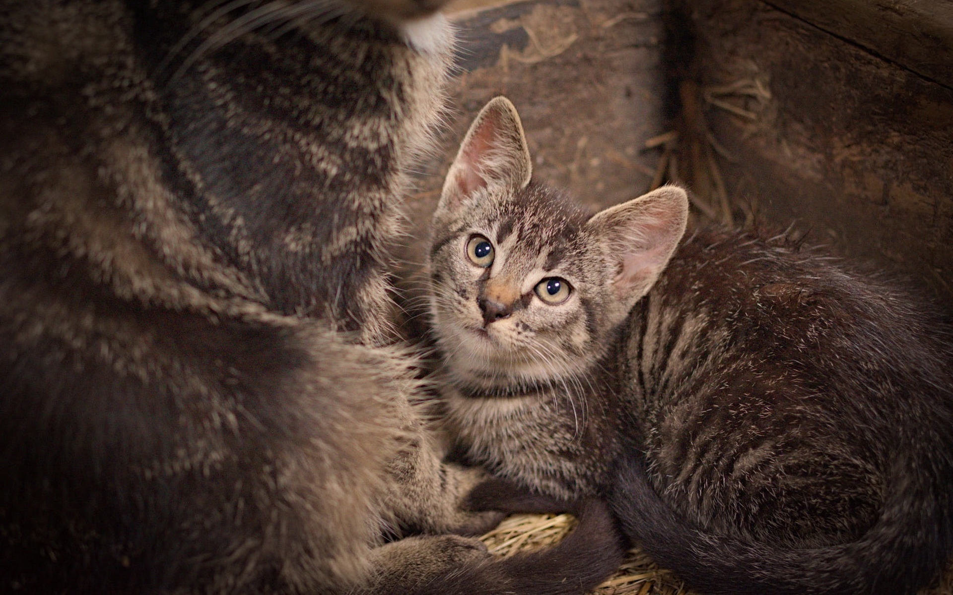 Description: A cat sitting next to another cat on a bed of hay and hay bales with a blurry background.