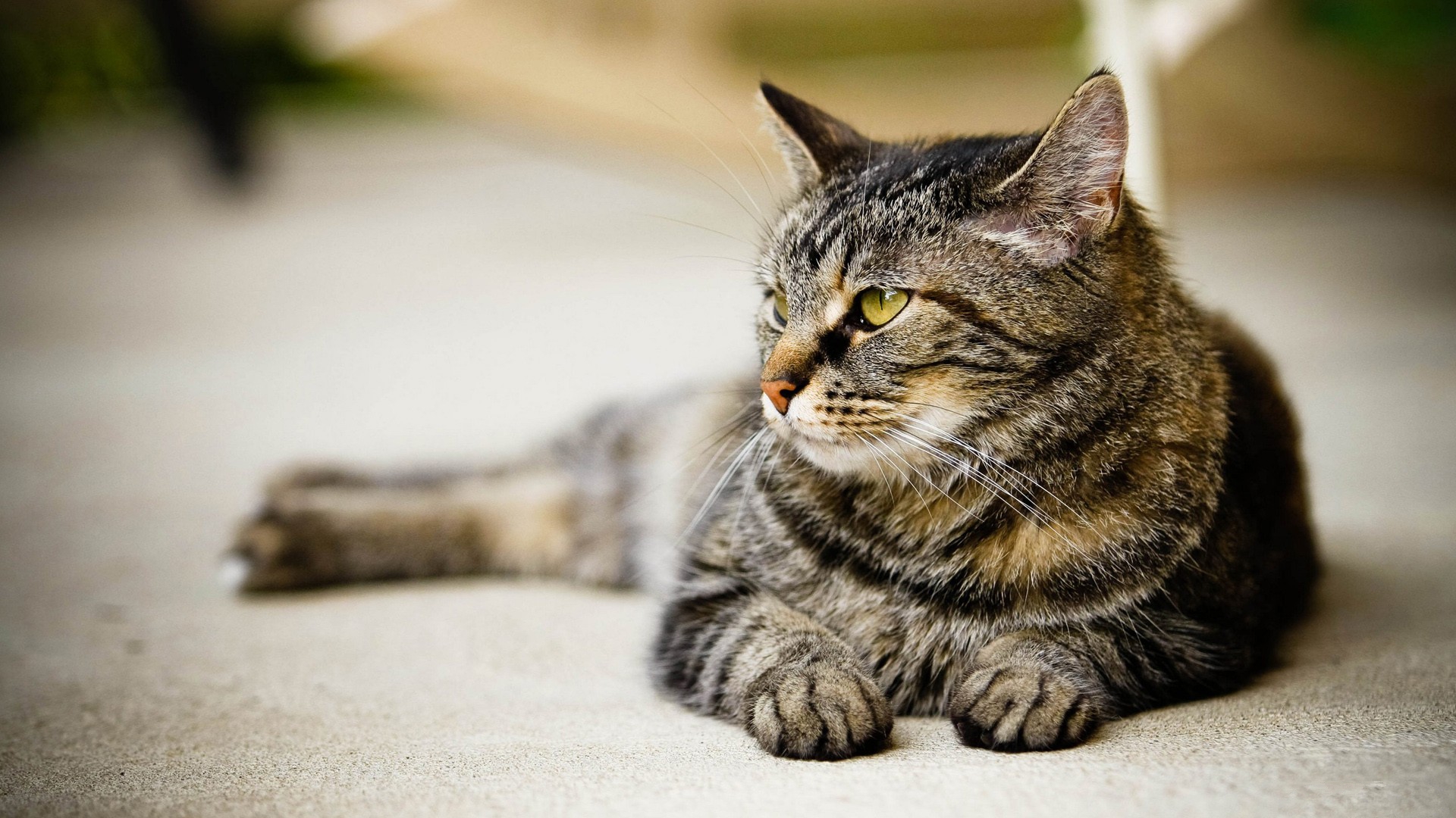Description: A cat laying on the ground looking at something in the distance with a blurry background of a cat.