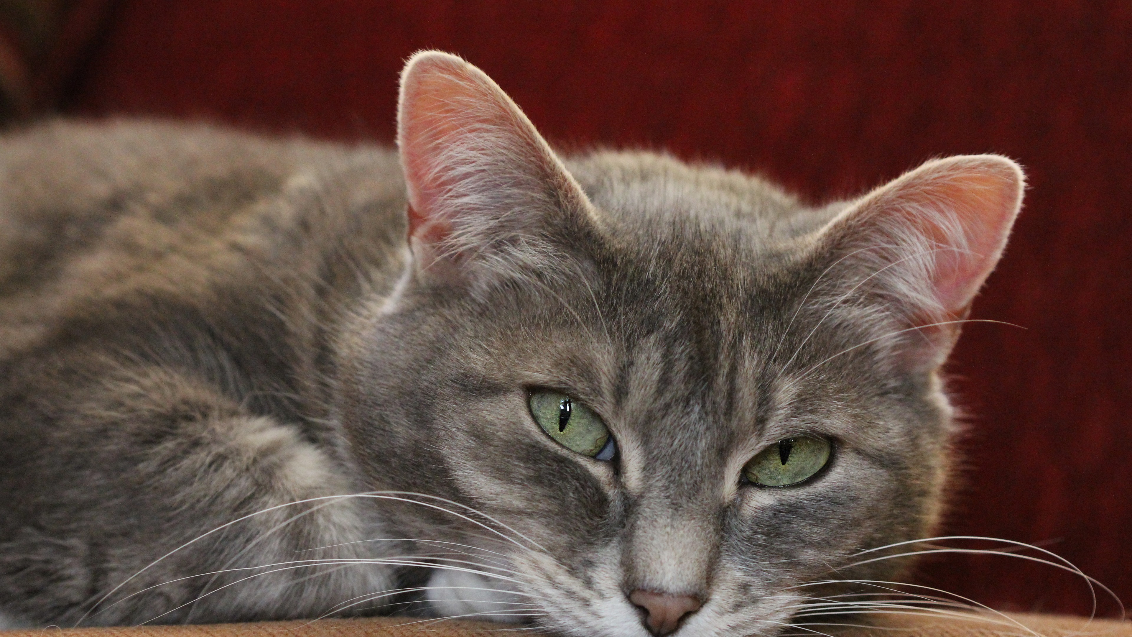 Description: A cat laying on a table with its eyes open and a red chair in the background with a red chair behind it.