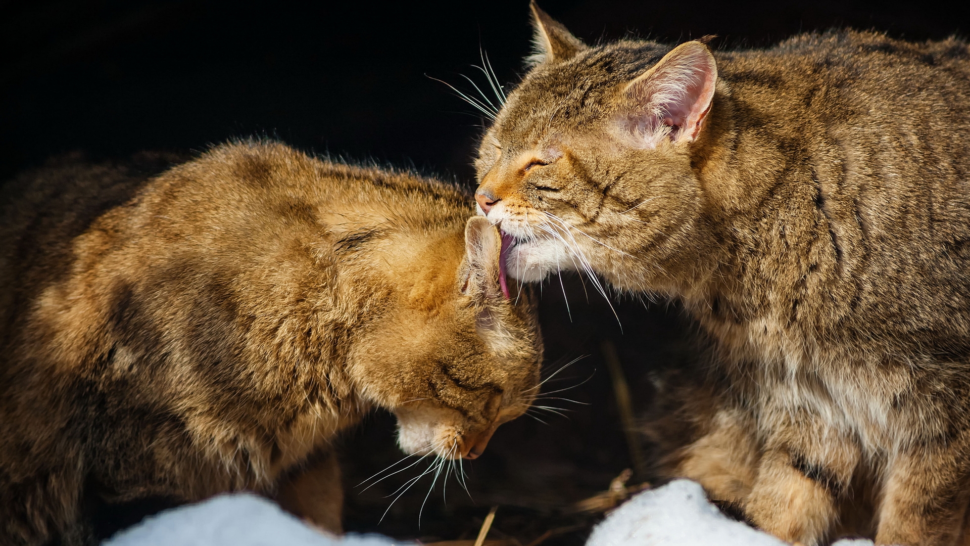 Description: A cat is licking another cat's face with its mouth open and it is standing in the snow.