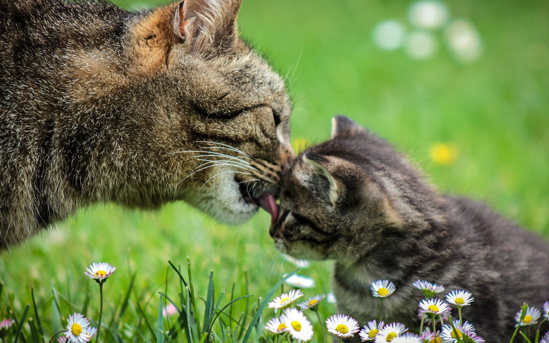 Description: A cat licking a kitten's face in a field of daisies and daisies flowers in the grass.
