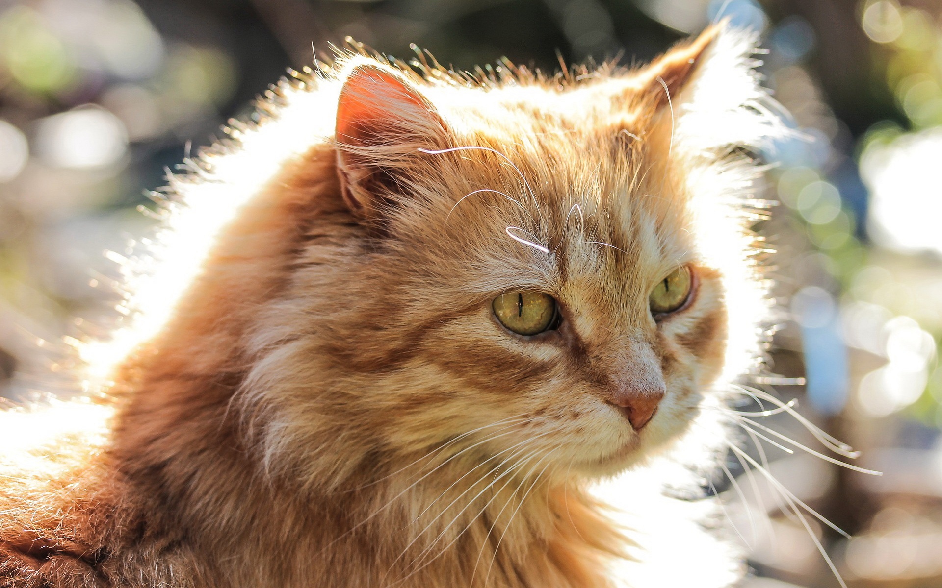 Description: A cat with a long hair and green eyes looking off into the distance with a blurry background of trees.