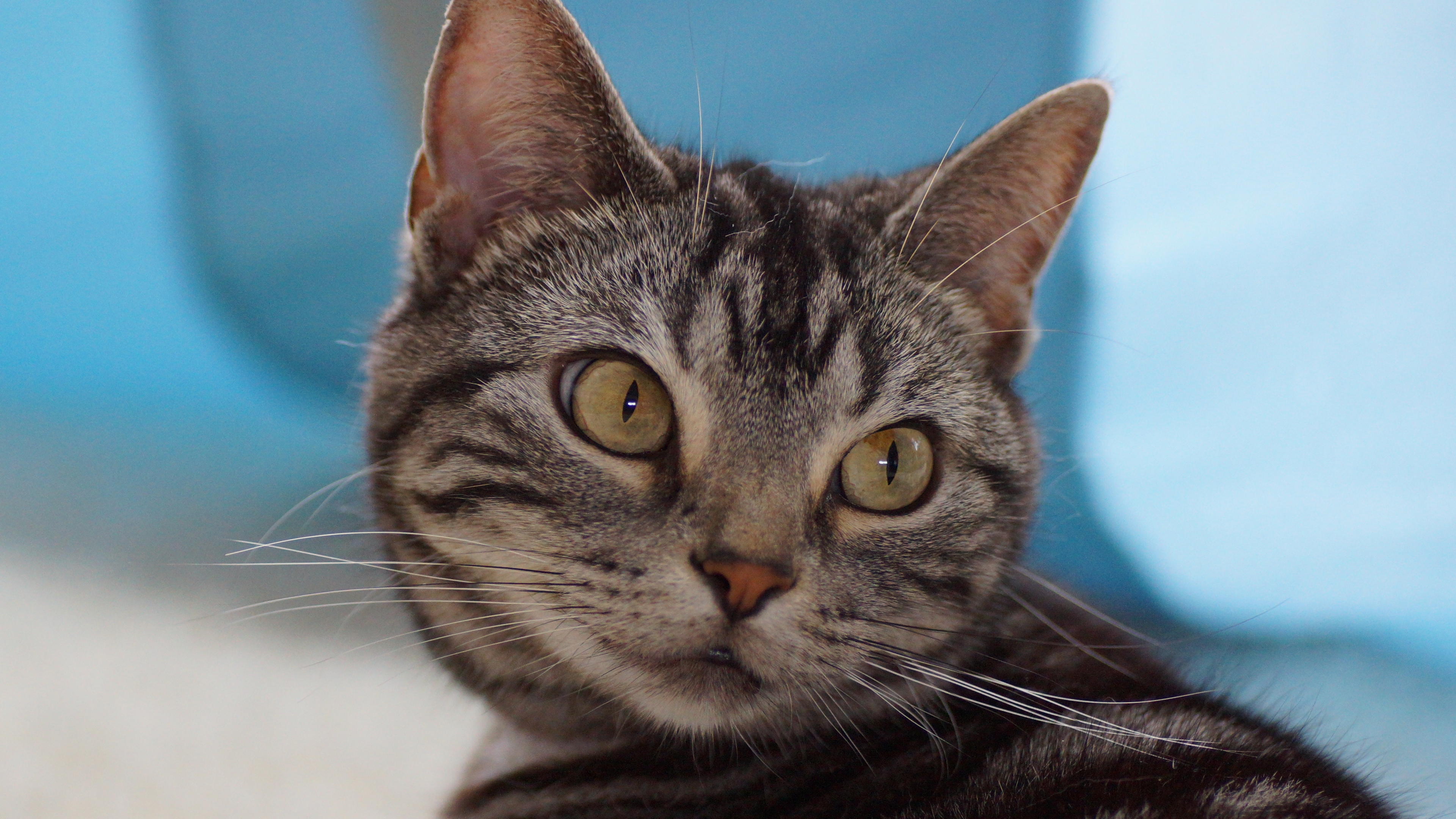 Description: A cat is looking at the camera while sitting on a chair with a blue background and a white carpet.