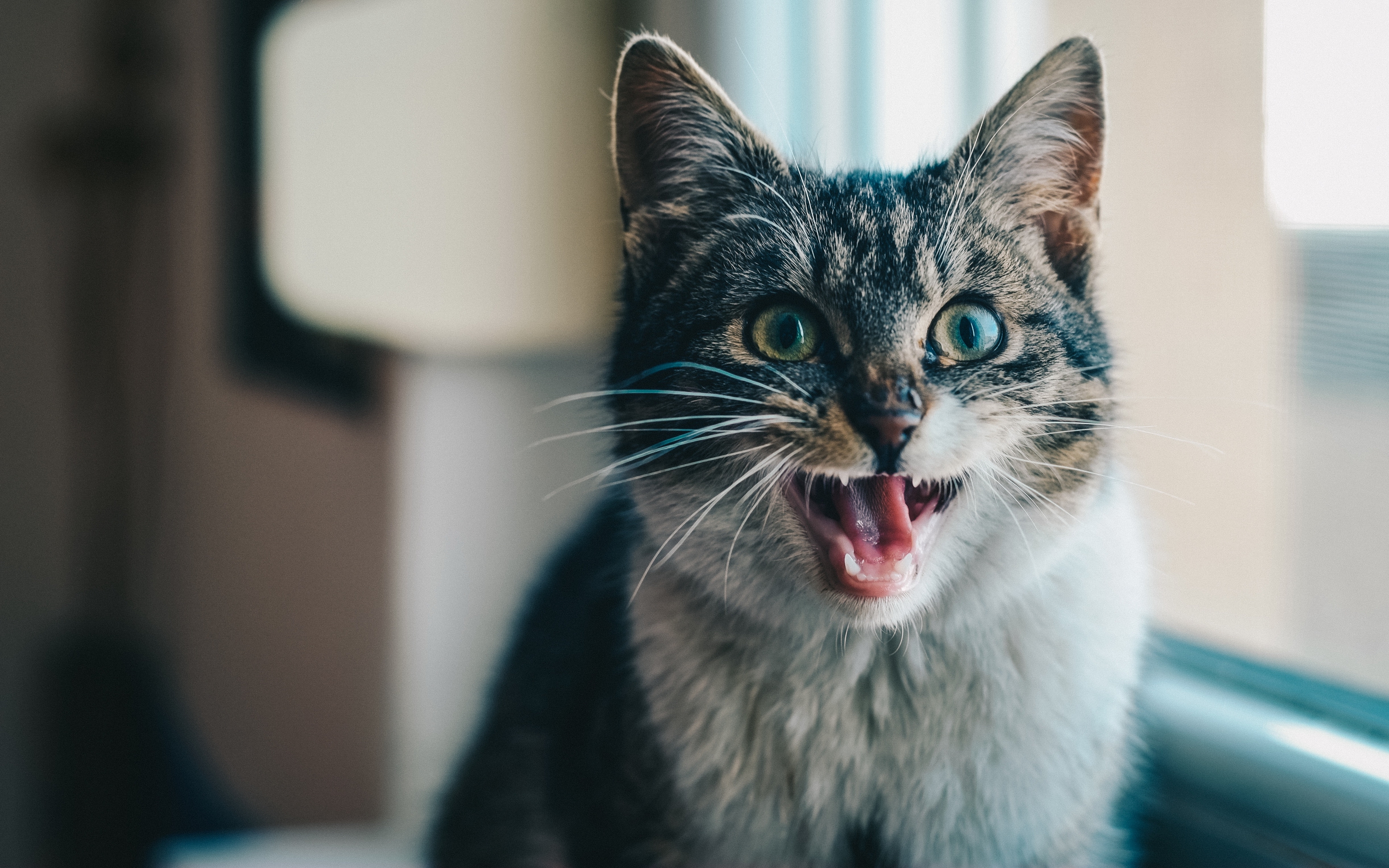 Description: A cat with its mouth open and it's mouth wide open and it's mouth wide open.