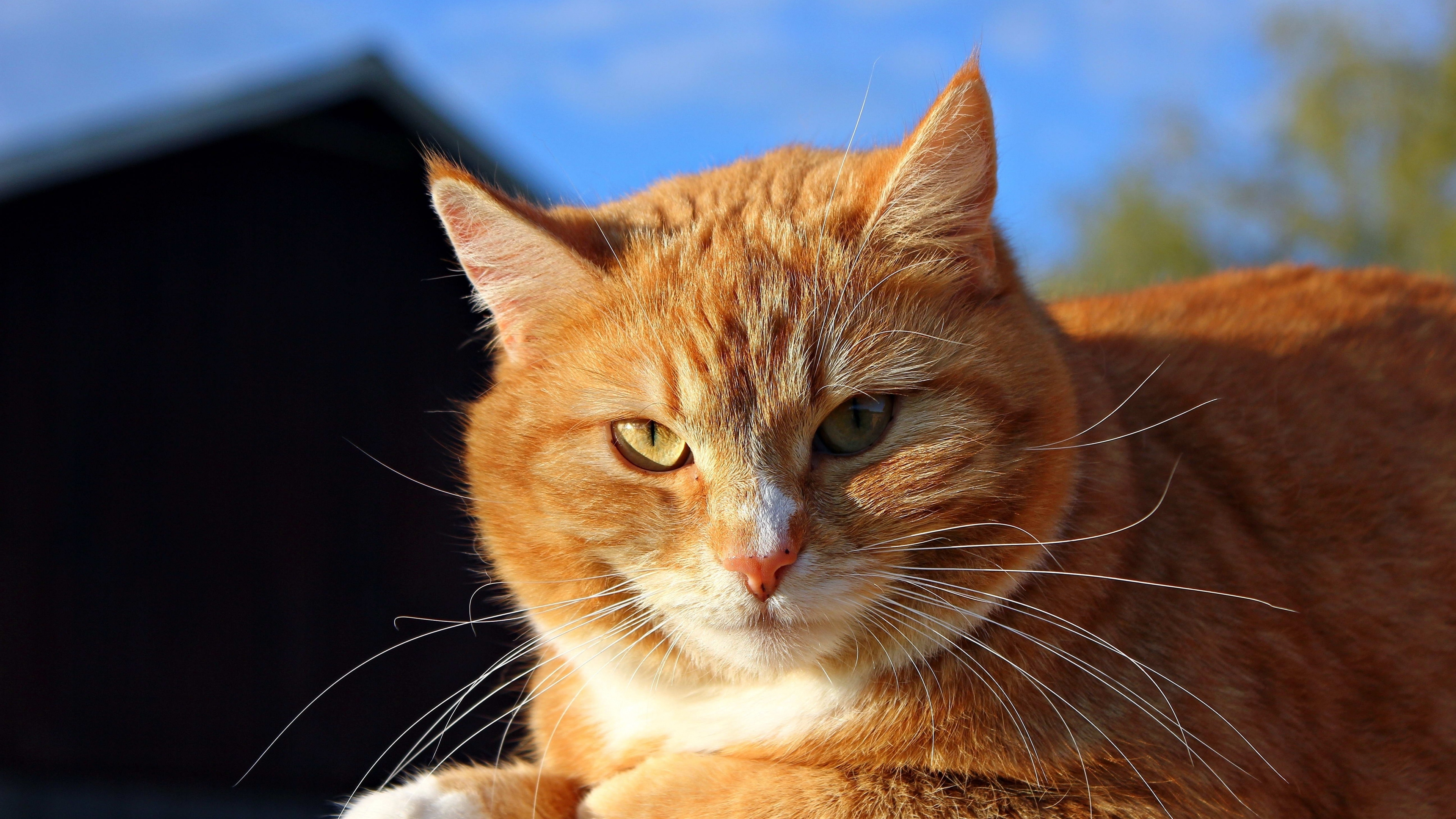 Description: A cat sitting on top of a wooden table next to a building and trees in the background with a blue sky.