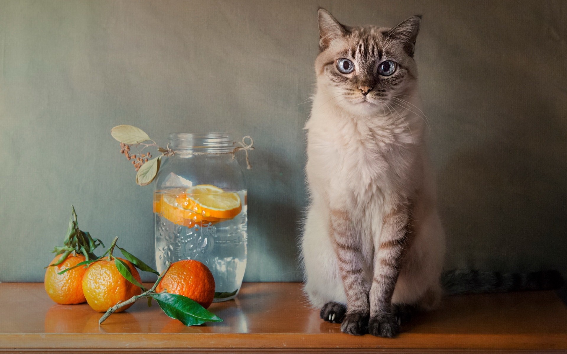 Description: A cat sitting on a table next to a jar of water and oranges on a table top with a glass of water.