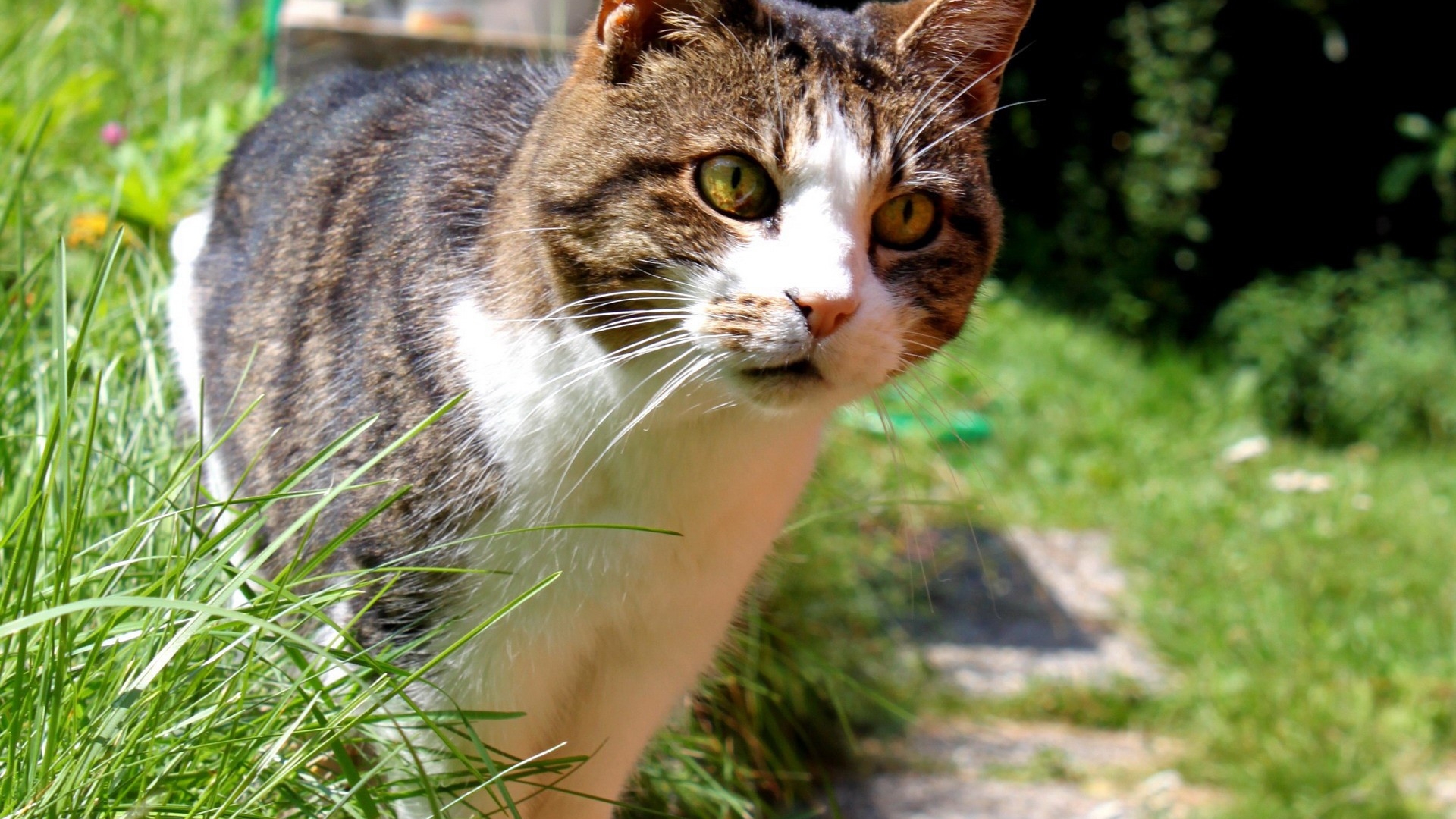 Description: A cat walking on a path in a grassy area with a bird feeder in the background and a green bush.