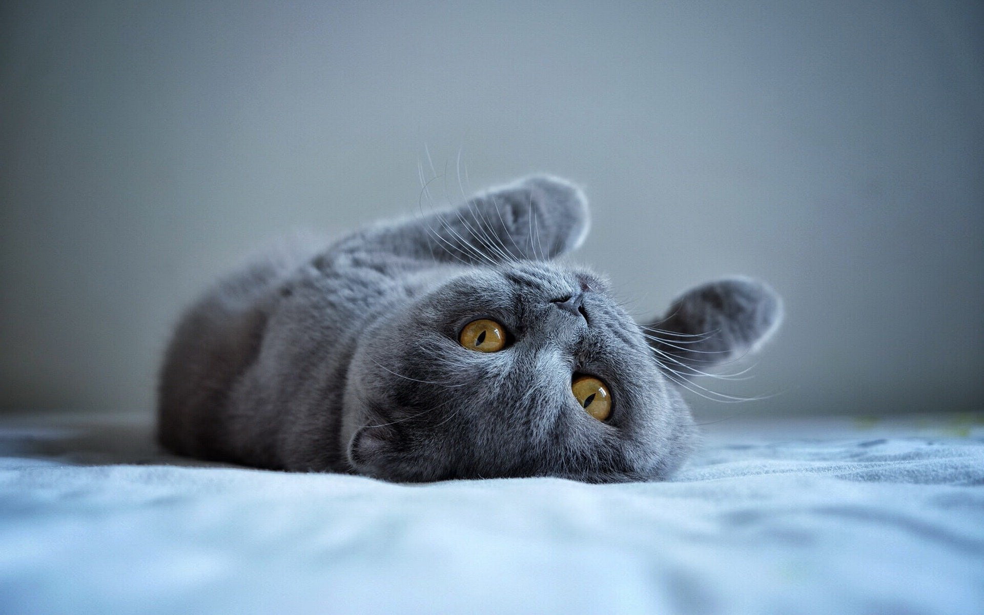 Description: A cat laying on its back on a bed with its eyes wide open and one paw up to the camera.