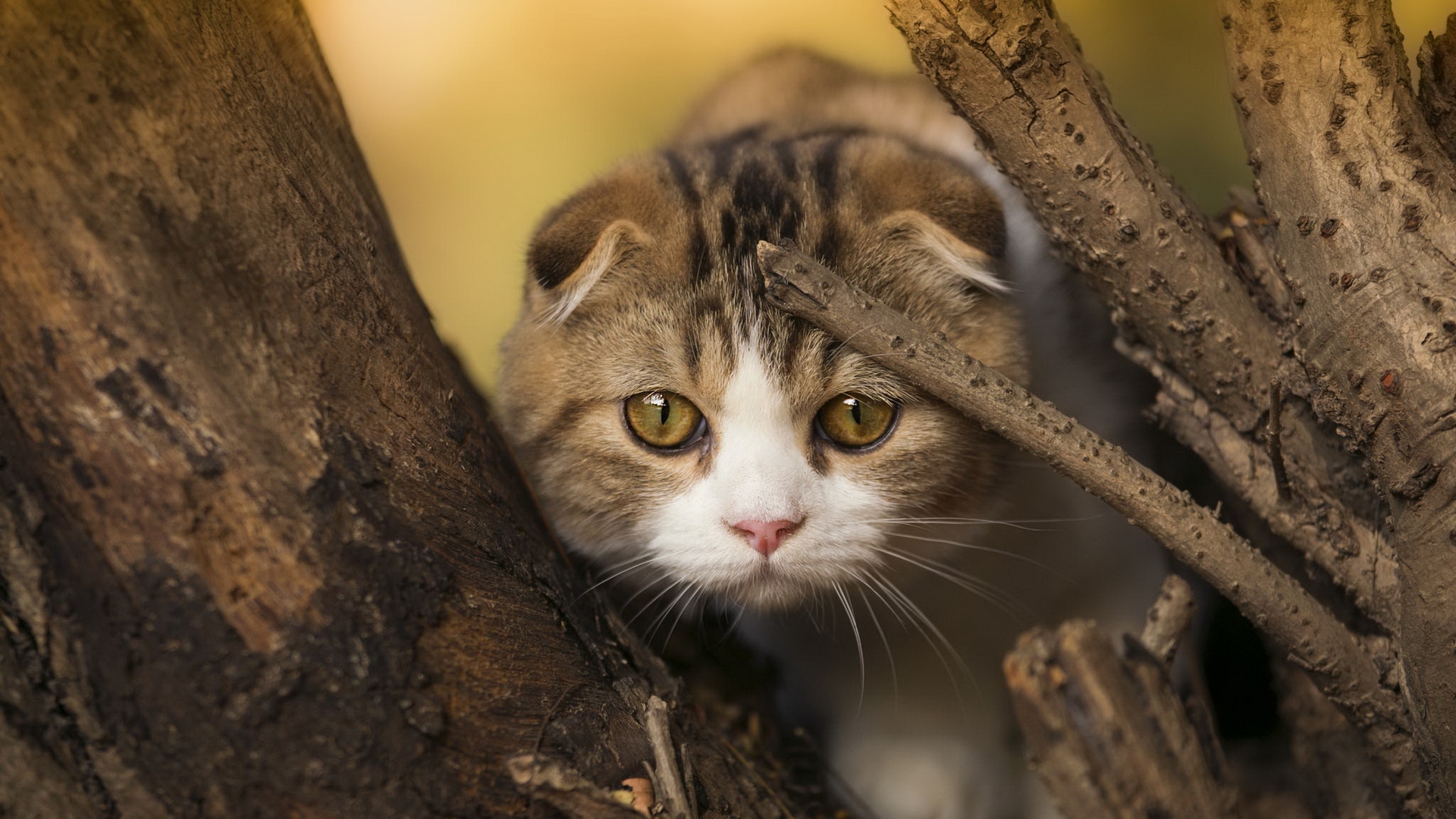 Description: A cat peeking out from behind a tree branch with a blurry background of leaves and branches.