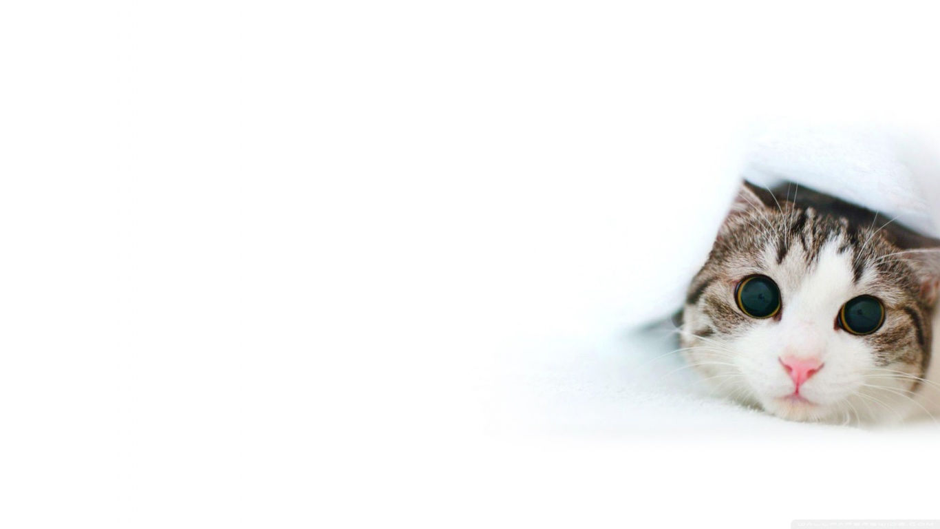 Description: A cat peeking out from behind a white wall with a white background and a white wall with a white wall and a white wall with a cat peeking out.