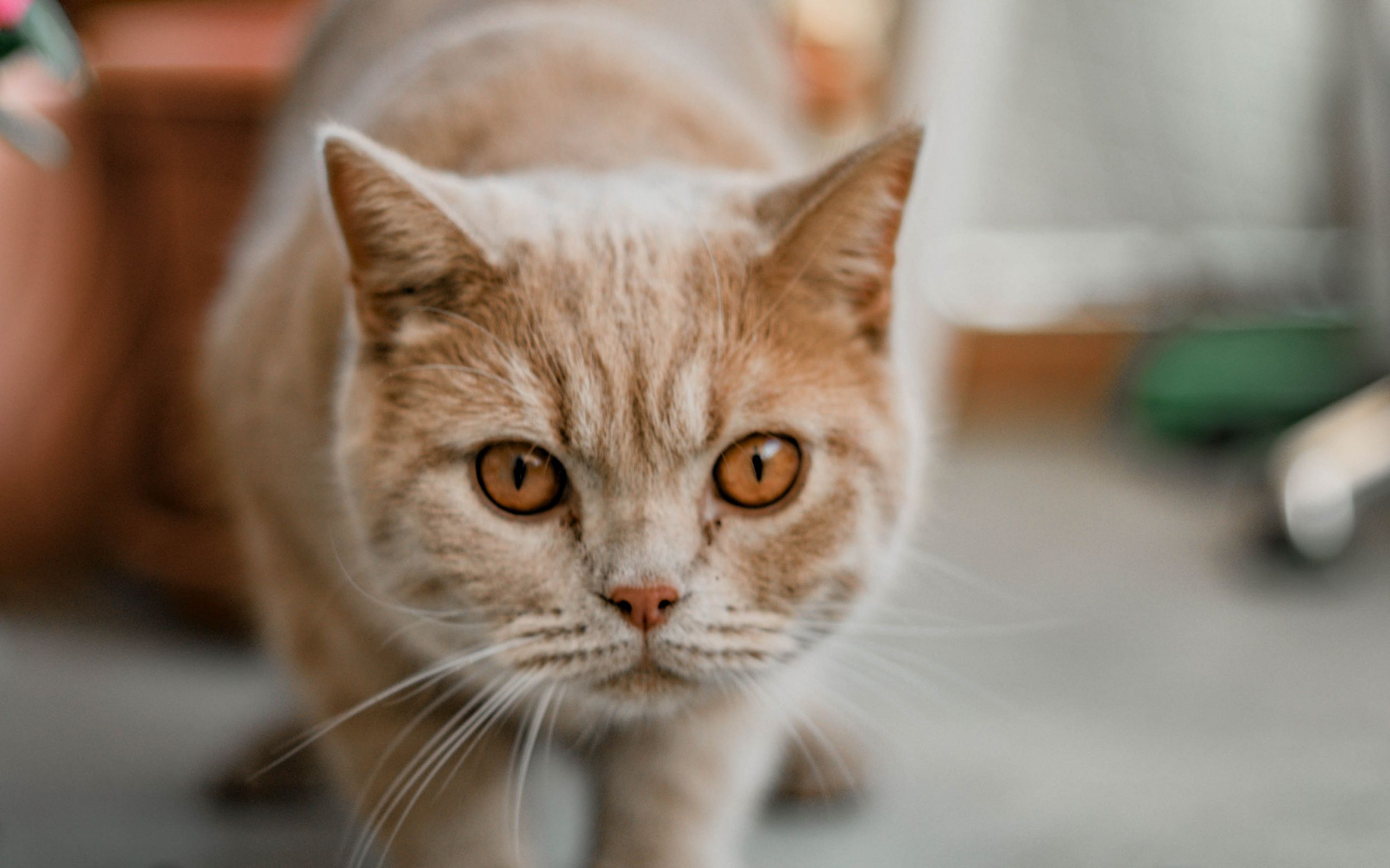 Description: A cat is walking on the floor near a planter and a chair in the background.
