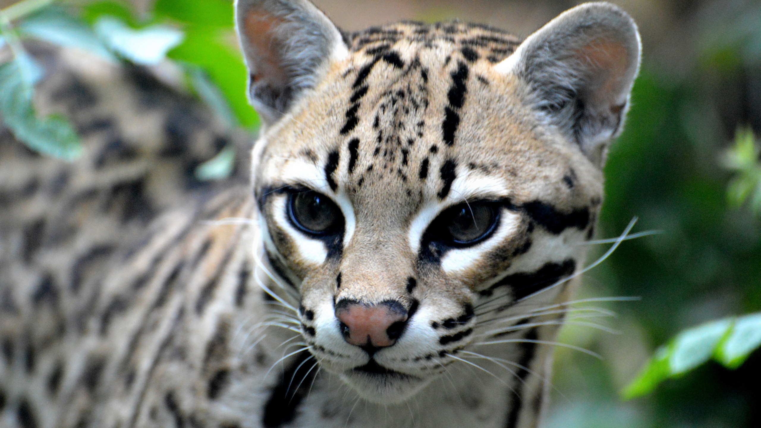 Description: A close up of a cat with a black and white face and a green background with leaves and branches.