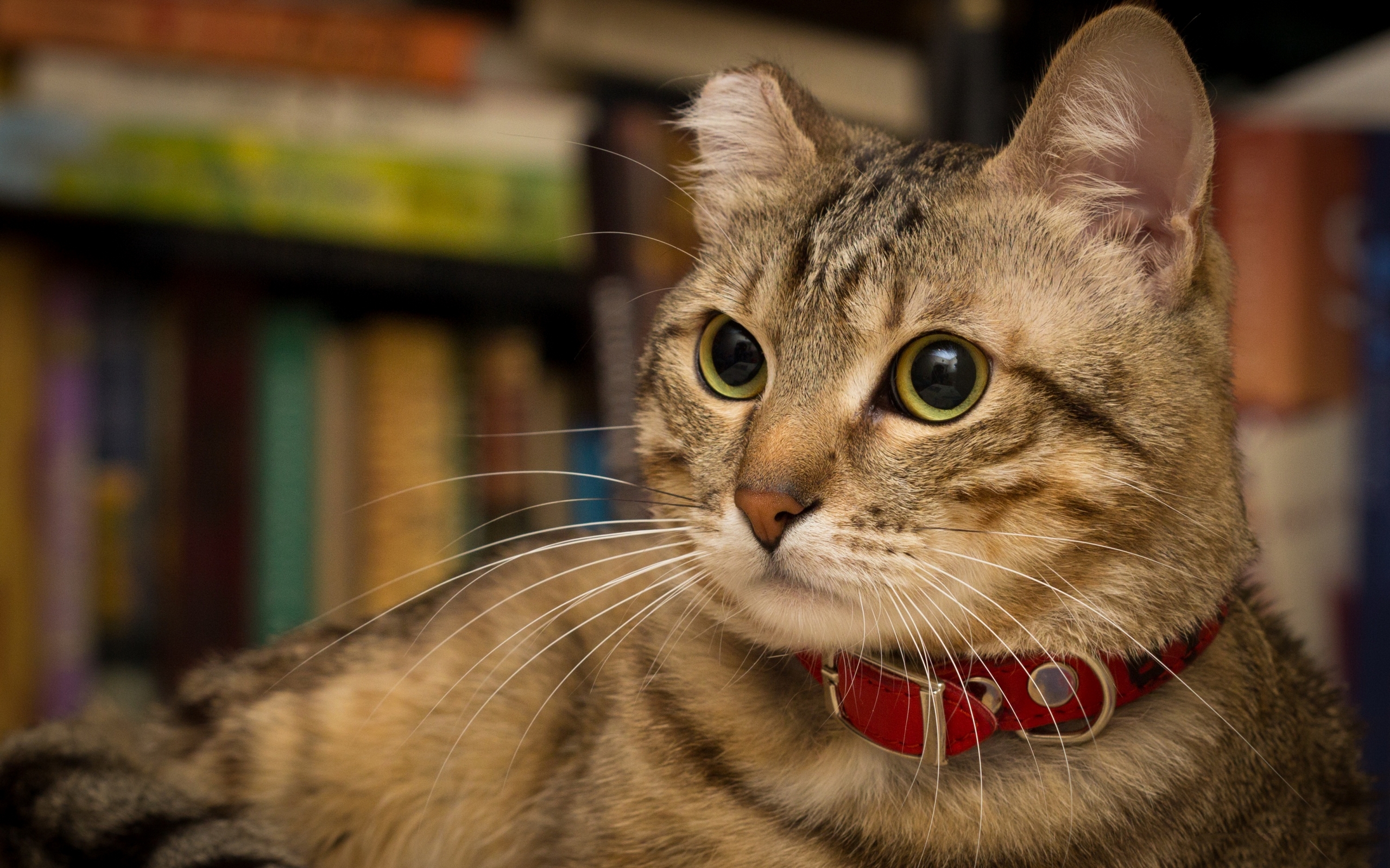 Description: A cat with a red collar looking at the camera with a blurry background of bookshelves in the background.